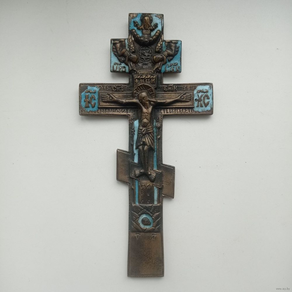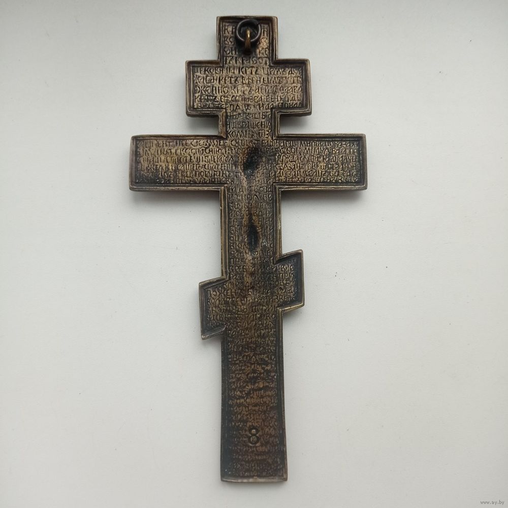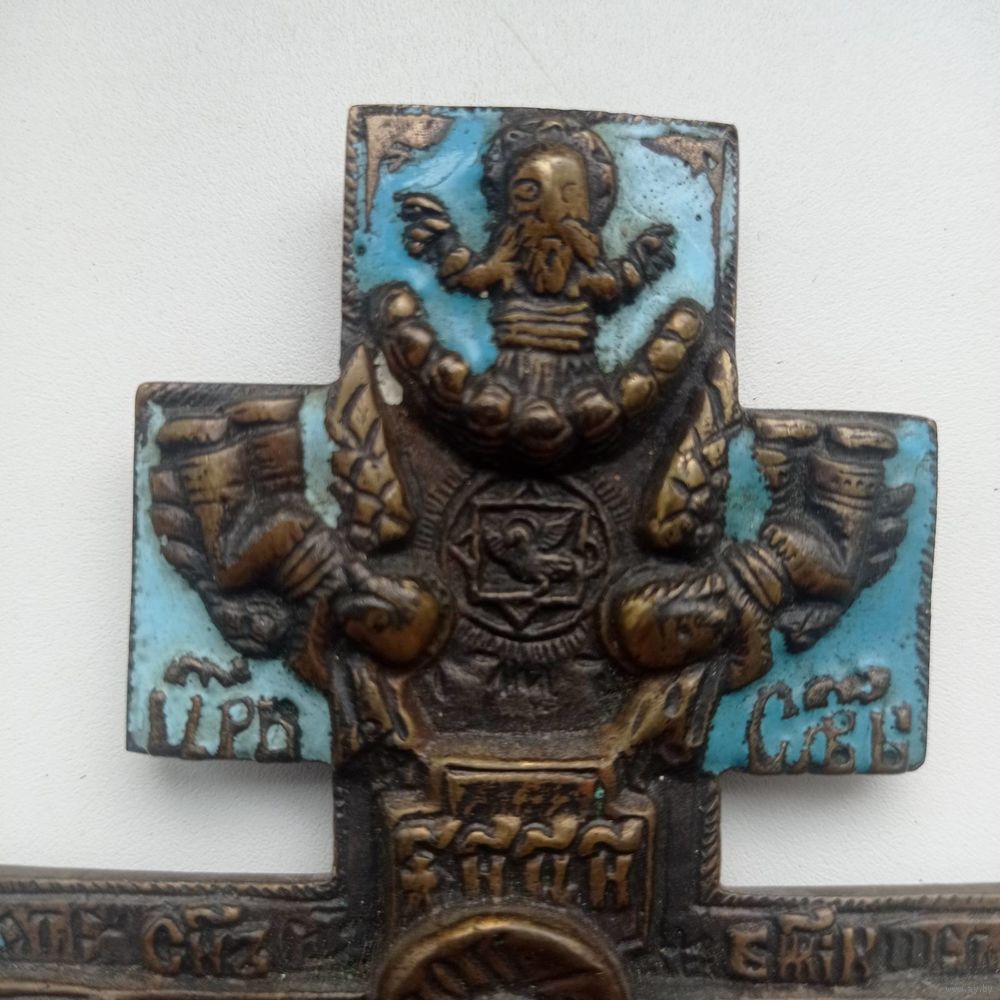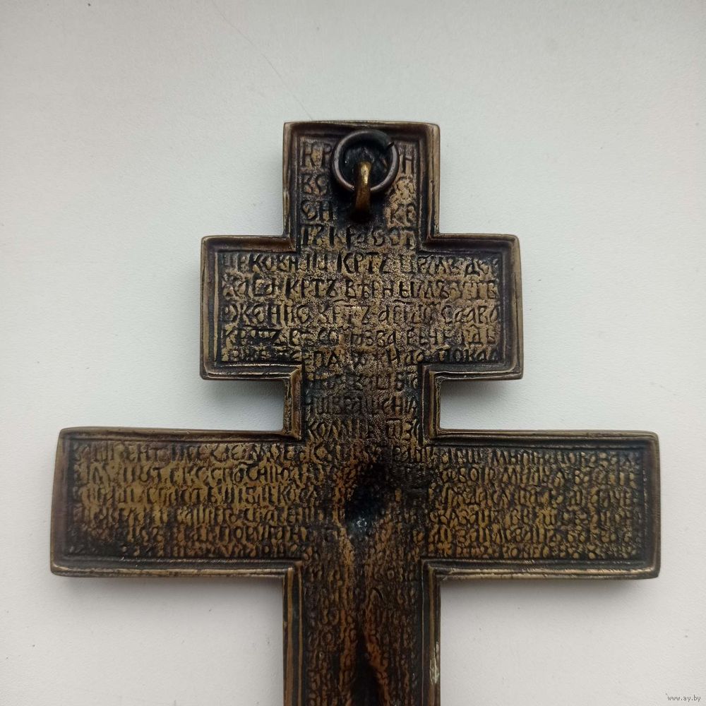 На лицевой стороне «Распятие Христово», на оборотной стороне отлит текст молитвы на старославянском языке, начинающийся со слов «Крест — хранитель всей Вселенной...».