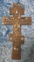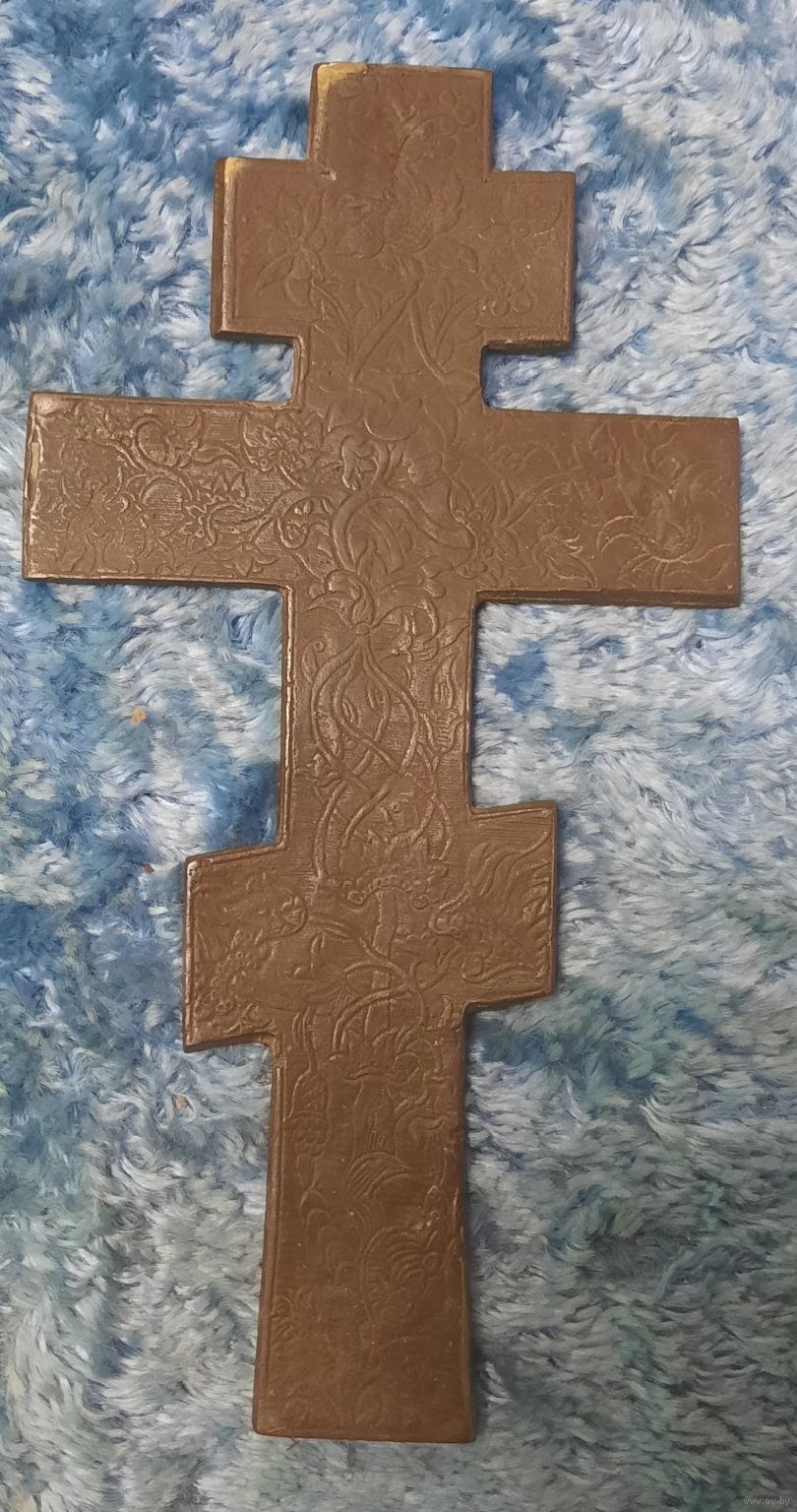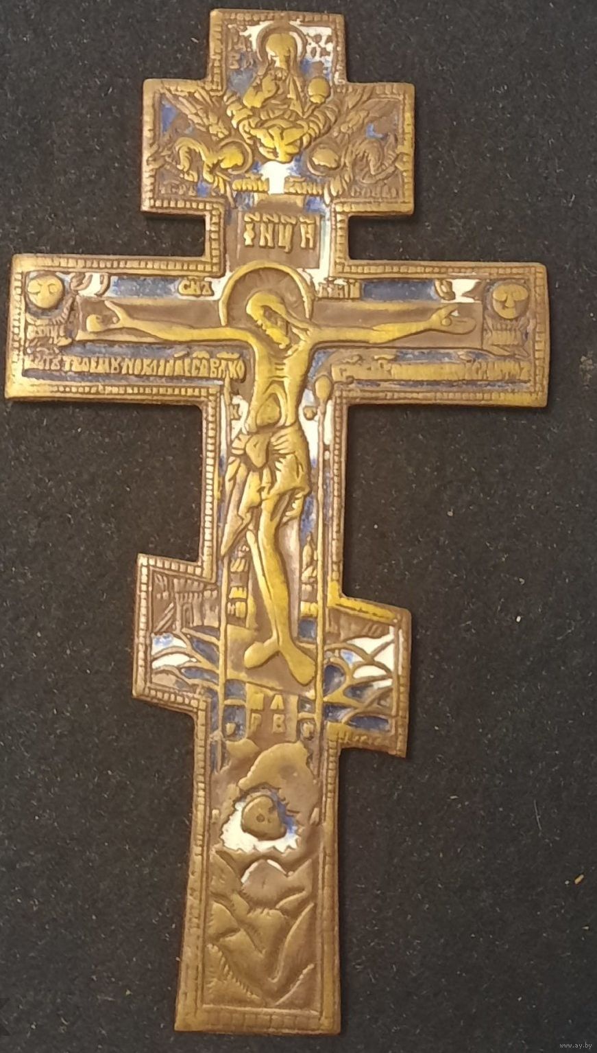 Крест. Распятие. Царизм. Медная пластика. Литьё. 2 цвета эмали. Сзади узор. Оригинал. Размер 19 х 10 см