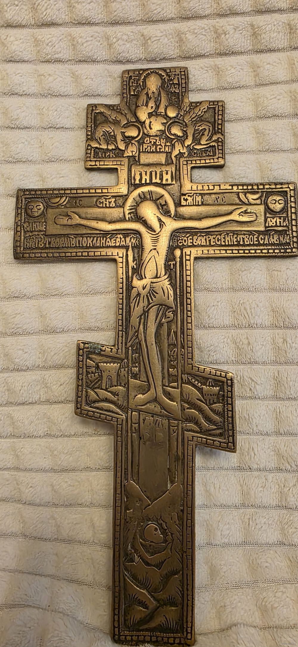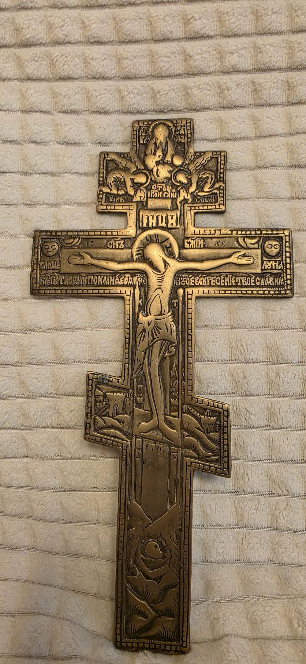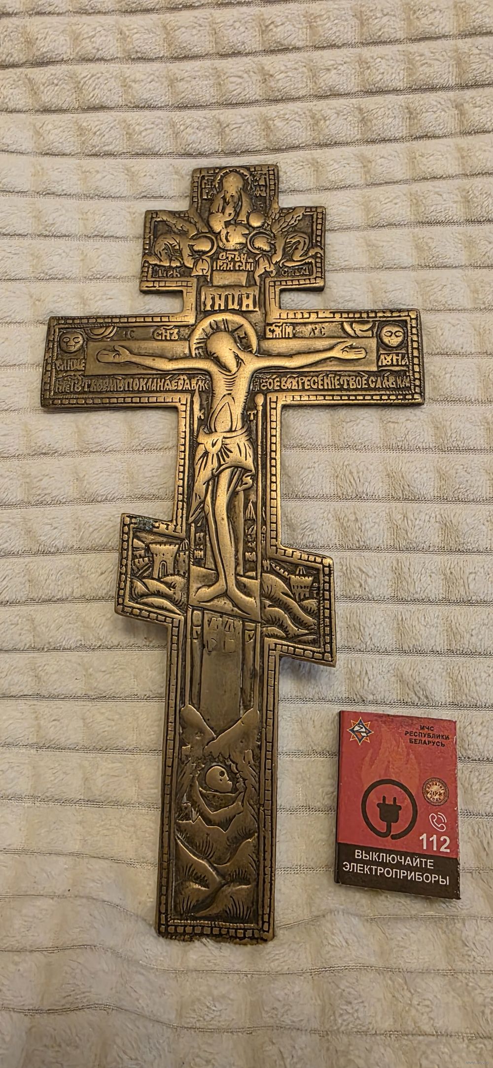 Крест распятие меднолитой. Размер 27 см*14 см. Обратная сторона в цветочном рисунке. Небольшая минимальная цена. Смотрите другие мои лоты. Высылаю почтой ЕВРОПОЧТОЙ