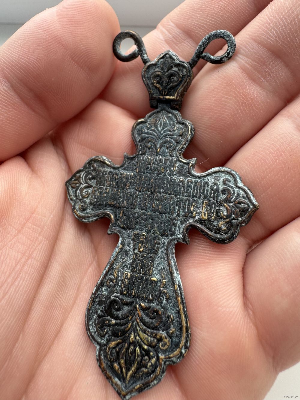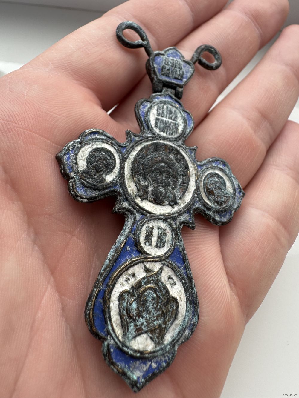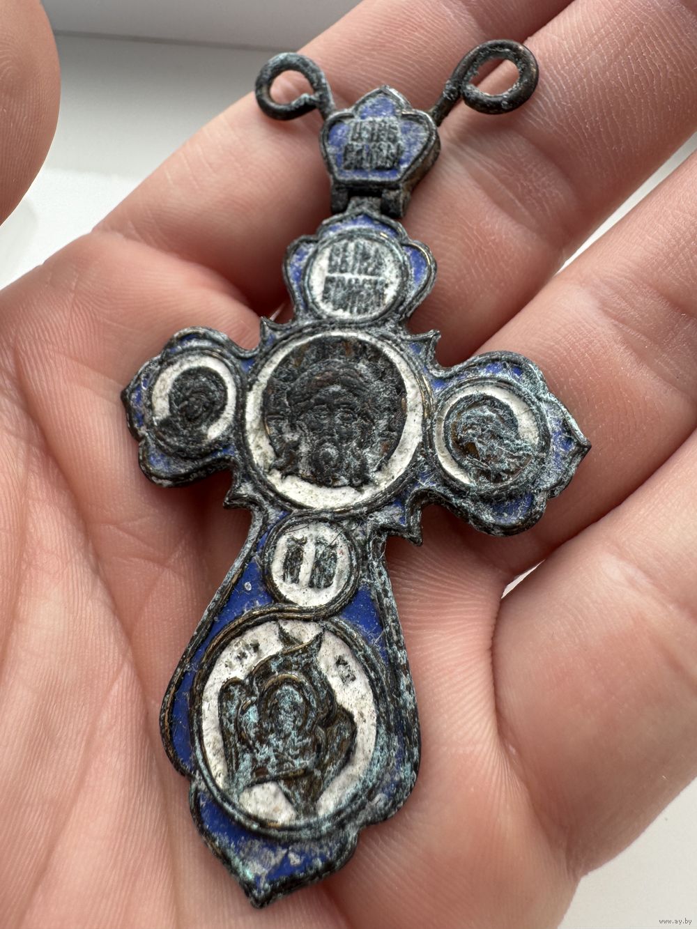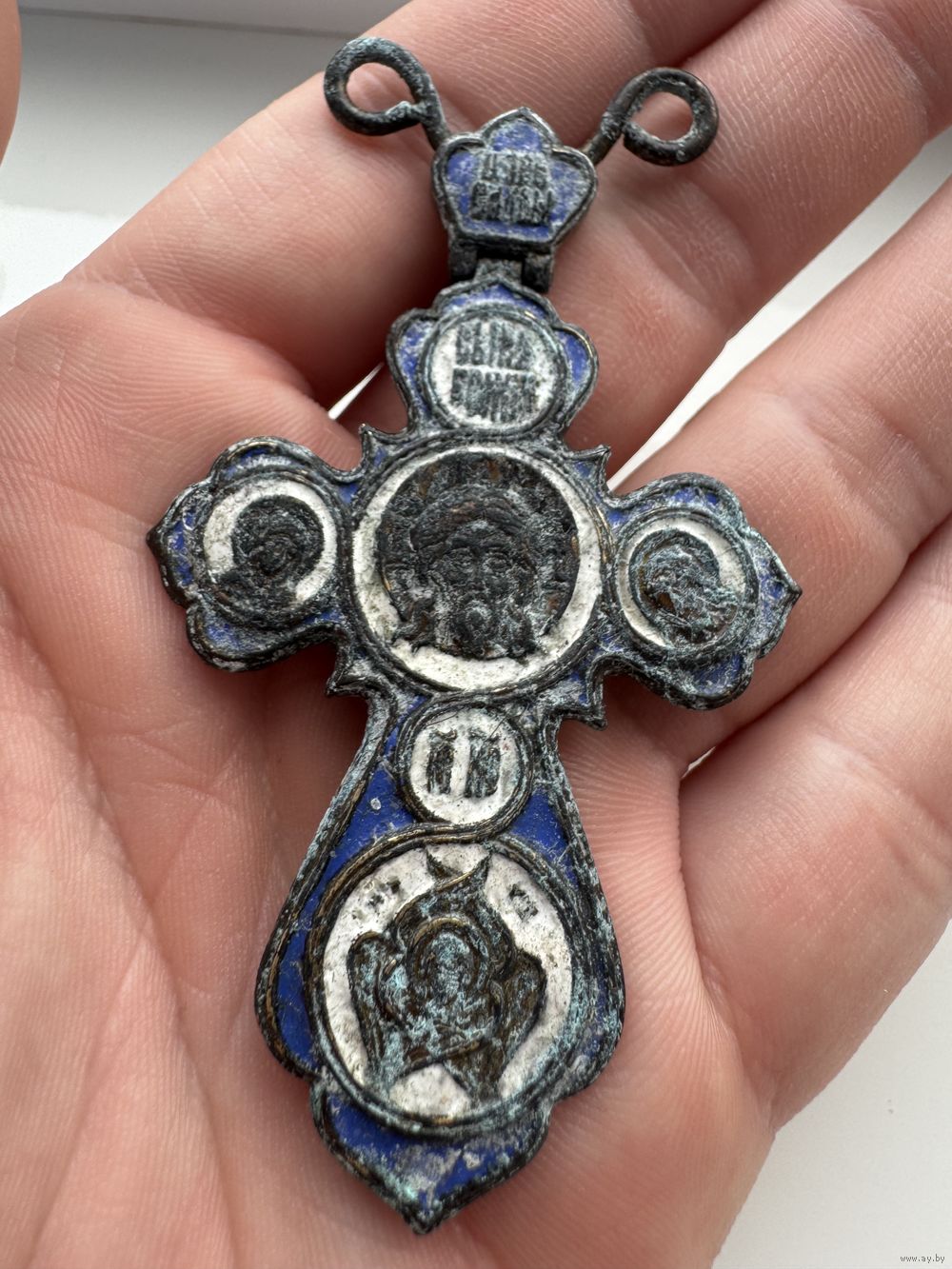 Крестик нательный старинный "Иисус со святыми" с Эмалями Синей и Белой