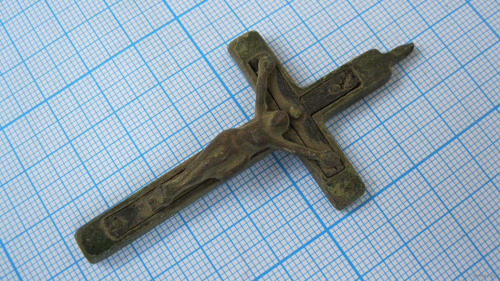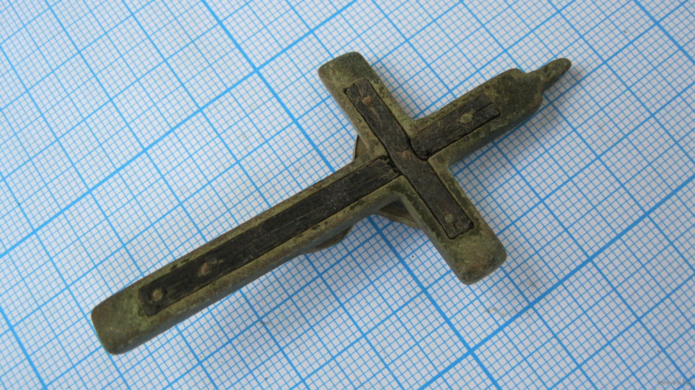 Крестик старинный, нательный. Католический. Распятие. Бронза, литье, днревянная вставка..