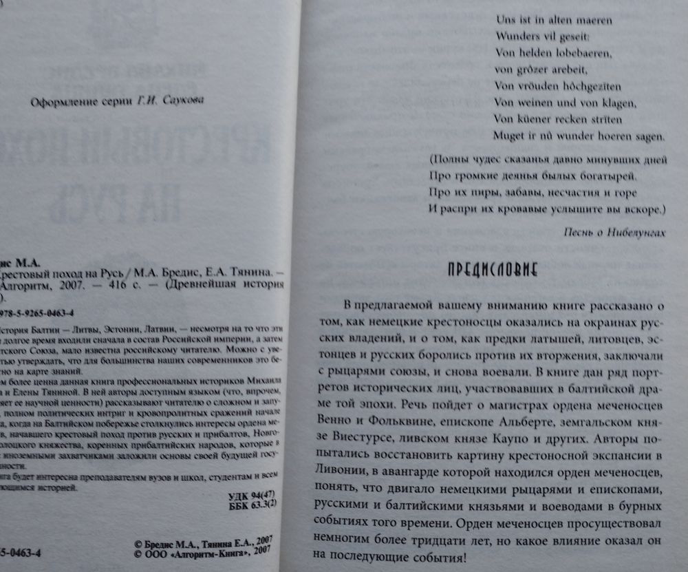 Тираж 4000 экз. 418 стр. История Балтии - Литвы, Эстонии, Латвии, - несмотря на то что эти страны долгое время входили сначала в состав Российской империи, а затем и Советского Союза, мало известна российскому читателю. Можно с уверенностью утверждать, что для большинства наших современников это белое пятно на карте знаний. Тем более ценна данная книга профессиональных историков Михаила Бредиса и Елены Тяниной. В ней авторы доступным языком (что, впрочем, не умаляет ее научной ценности) рассказывают читателю о сложном и запутанном, полном политических интриг и кровопролитных сражений начале XIII века, когда на Балтийском побережье столкнулись интересы ордена меченосцев, начавшего крестовый поход против русских и прибалтов, Новгорода, Полоцкого княжества, коренных прибалтийских народов, которые в борьбе с иноземными захватчиками заложили основы своей будущей государственности.