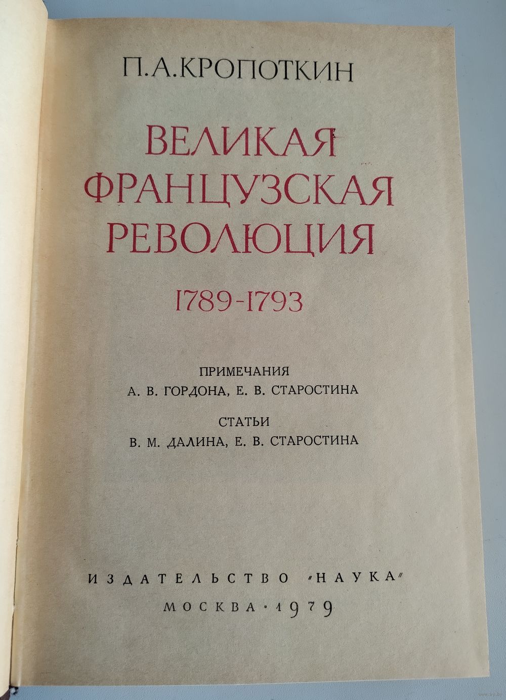 Кропоткин Петр Алексеевич. Великая Французская революция (1789 -1793). Серия: Памятники исторической мысли. Примечания: А.В. Гордона, Е.В. Старостина. Статьи: М.В. Далина, Е.В. Старостина. Москва: Наука. 1979 г., 576 с., ил. Твёрдый переплет, обычный формат.