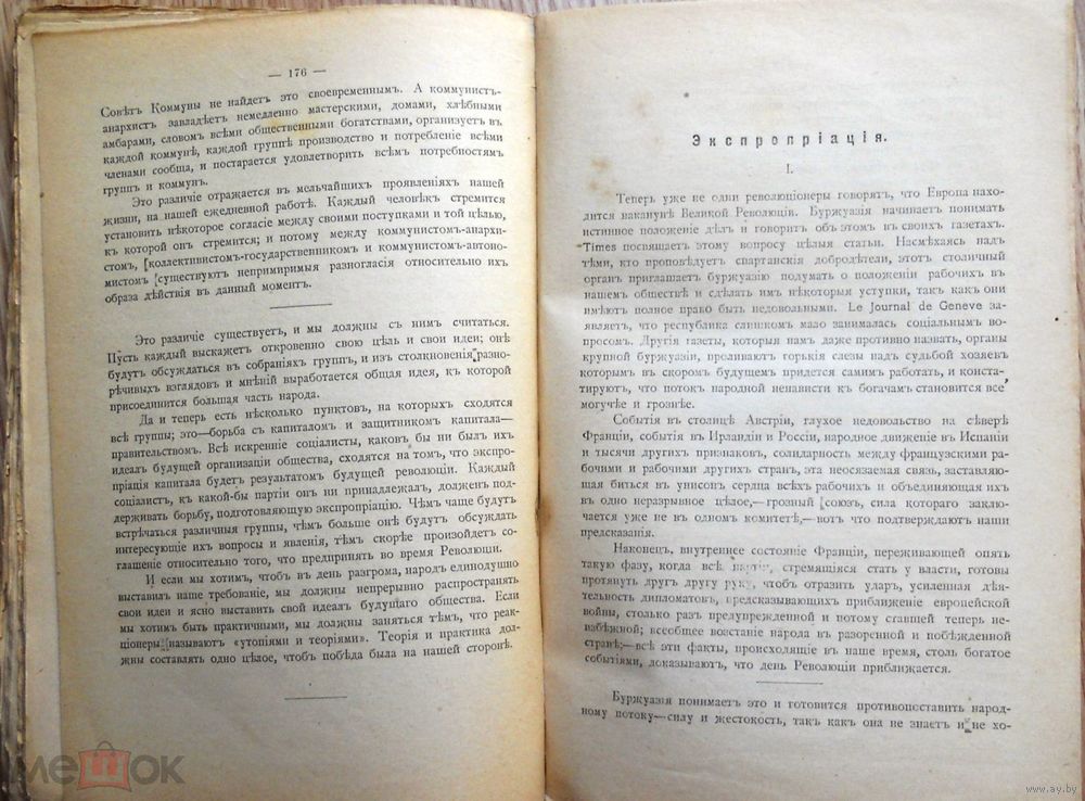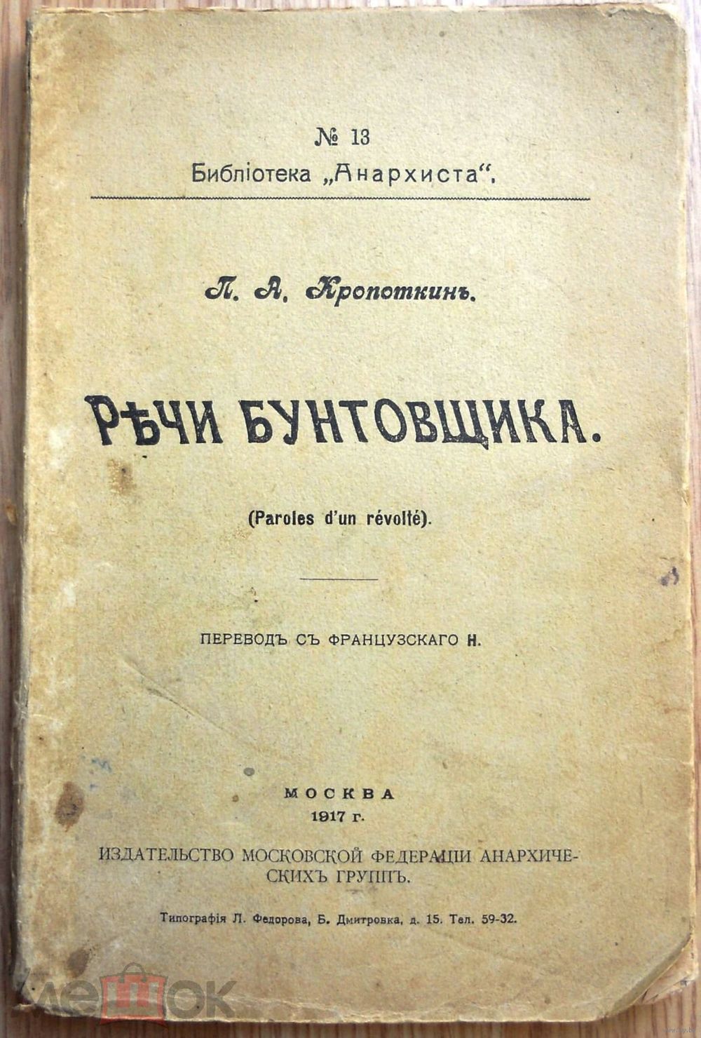 Издательский мягкий перевод, имеются не разрезанные страницы. Отсутствует 1 см. верхняя часть задней обложки. Описание: В основу книги положены статьи, написанные известнейшим теоретиком анархизма, Петром Алексеивичем Кропоткиным для газет «Le Revolte» и «La Revolte». Впервые опубликована в 1885 г.; на французском языке под названием «Paroles d'un Revolte». Так как Кропоткин был арестован почти сразу после написания статьи «Экспроприация», первое издание было осуществлено Элизе Реклю и другими товарищами. На русском языке несколько глав впервые вышли в 1903 г. (Женева) в двух выпусках под названием «Распадение современного строя», а полностью книга -- в 1906 г. (Пб.) в переводе Тамашевых.