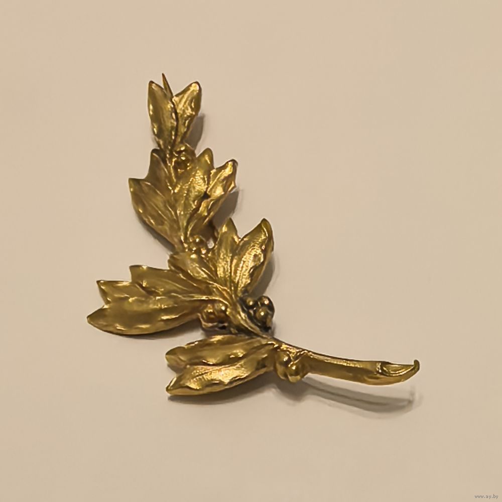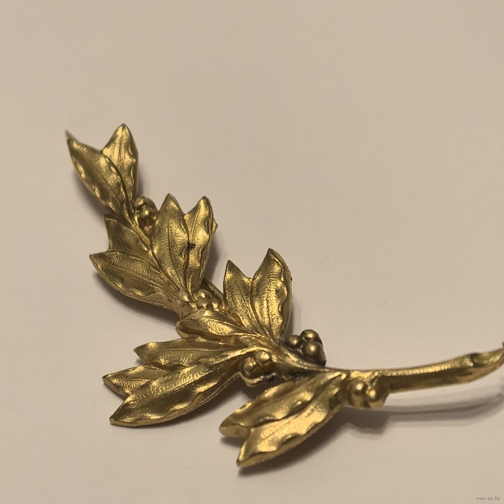 Крупная эффектная испанская брошь-игла в виде лавровый ветви. Позолота.