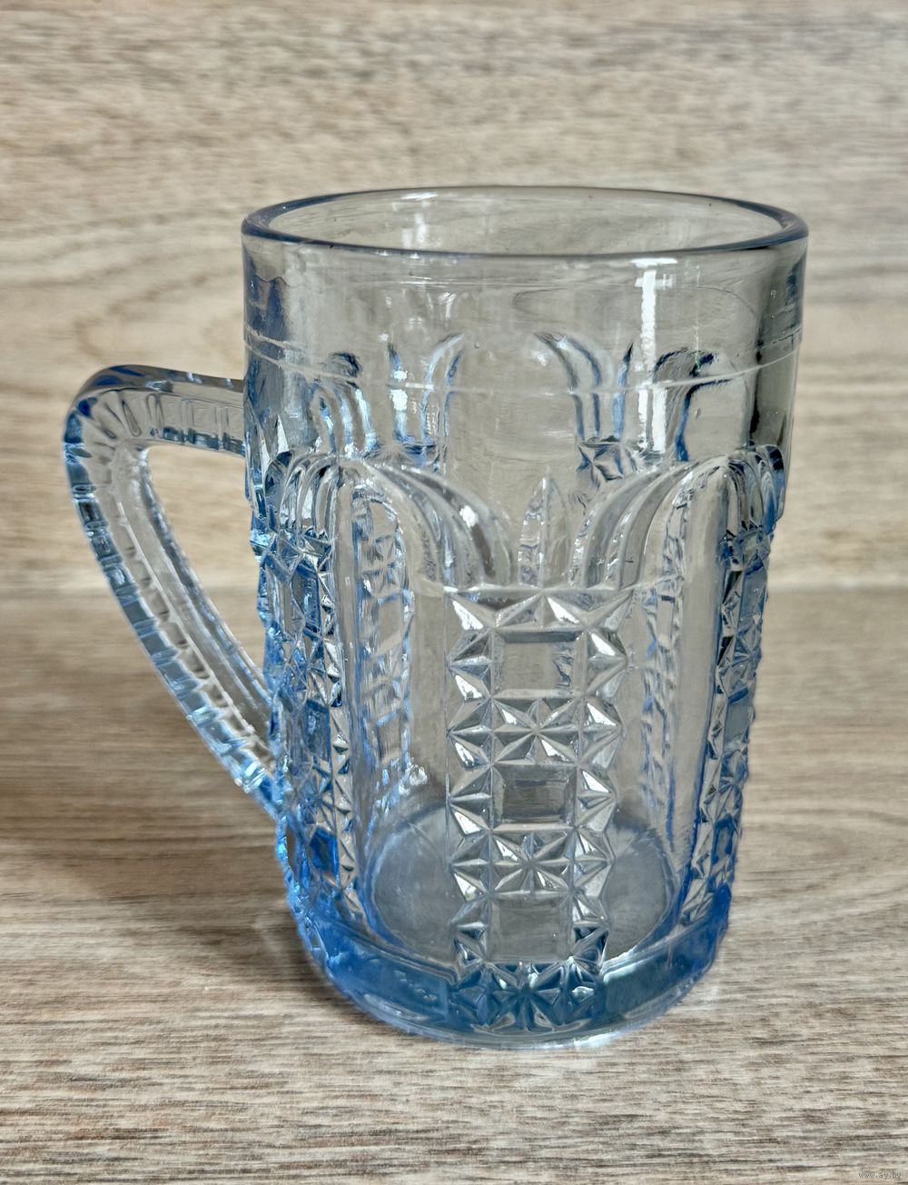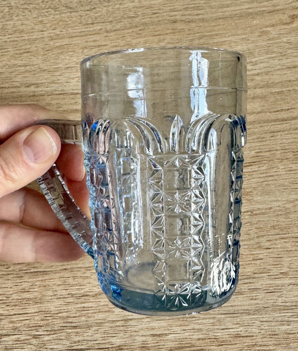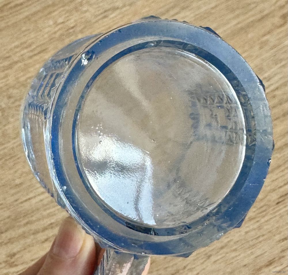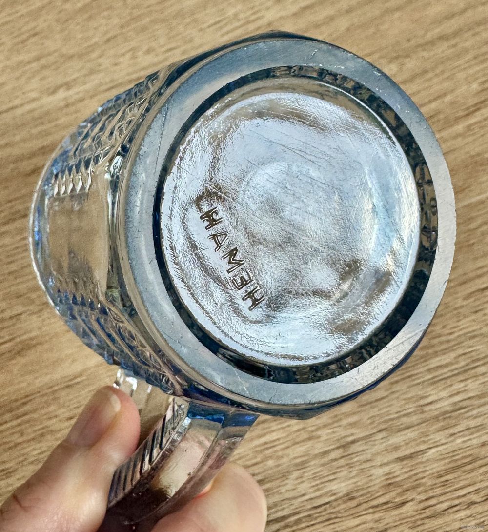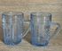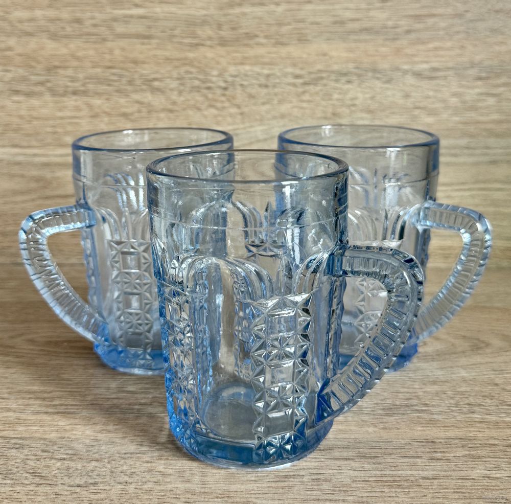 Кружки для хрена (без крышек) из стекла голубого цвета. Неман. На одной имеется небольшой скол на основании. Кружка более насыщенного цвета с маркировкой Неман. Высота каждой 10см.