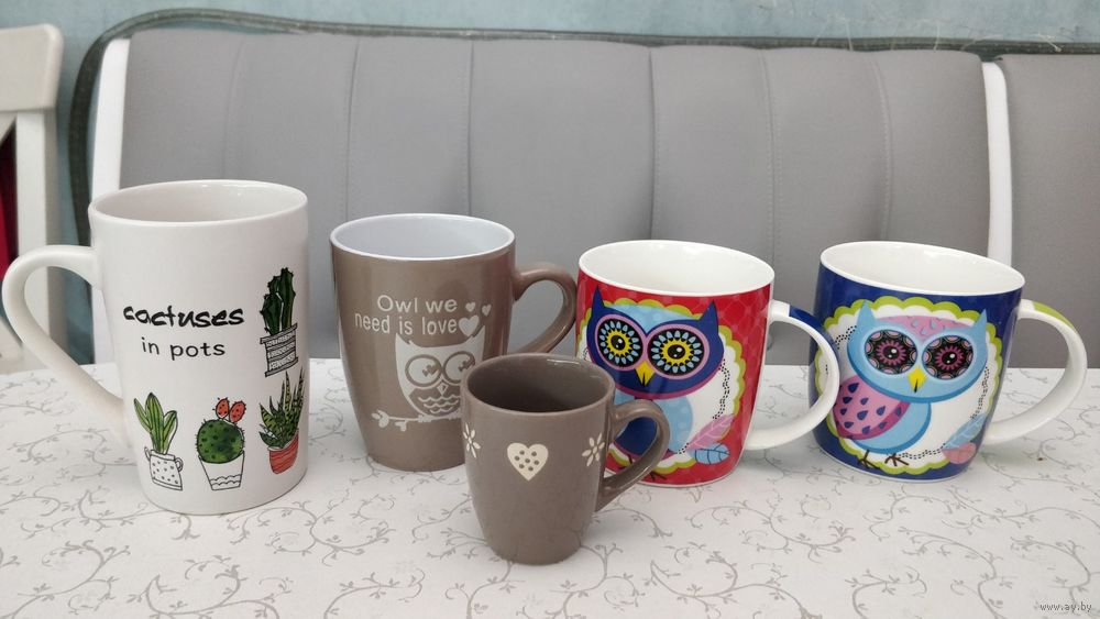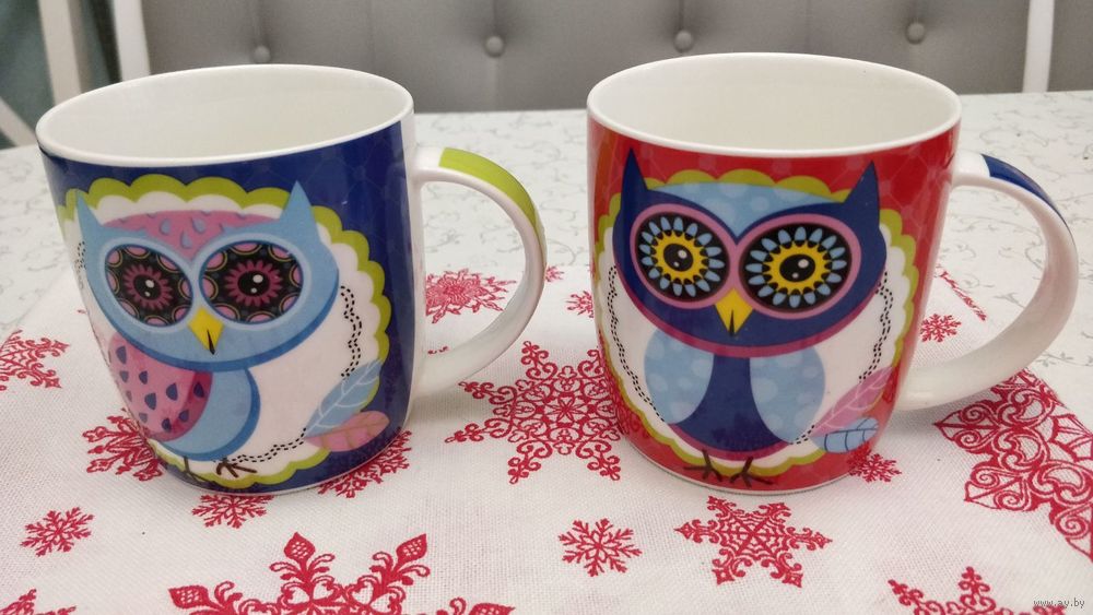 - фарфоровые кружки с изображением совы с двух сторон объёмом 400 мл каждая и общей стоимостью 15 рублей за 2 изделия, либо по 8 рублей за одну кружку (фотографии №2,3);