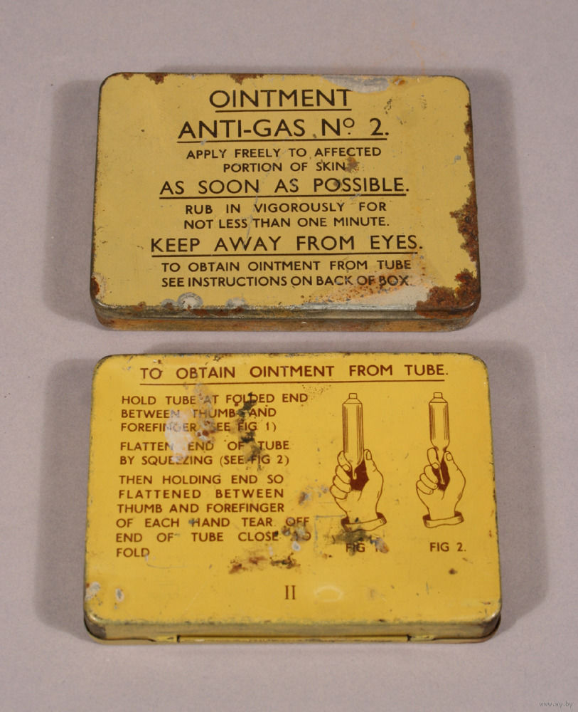 Жестяные банки с тюбиками мази, предназначенной для использования в случае газовой атаки. Правительство выпустило противогазы, чтобы развеять опасения, что противник может атаковать отравляющим газом. Они затрудняли дыхание и пахли резиной и дезинфицирующим средством. Чтобы успокоить маленьких детей, были выпущены яркие версии с именами вроде «Микки Маус» или «Дональд Дак». Чехлы для противогазов стали модным аксессуаром, особенно востребованными были чехлы из меха. Под противогазы носили специальные очки. Противогазы никогда не были необходимы.