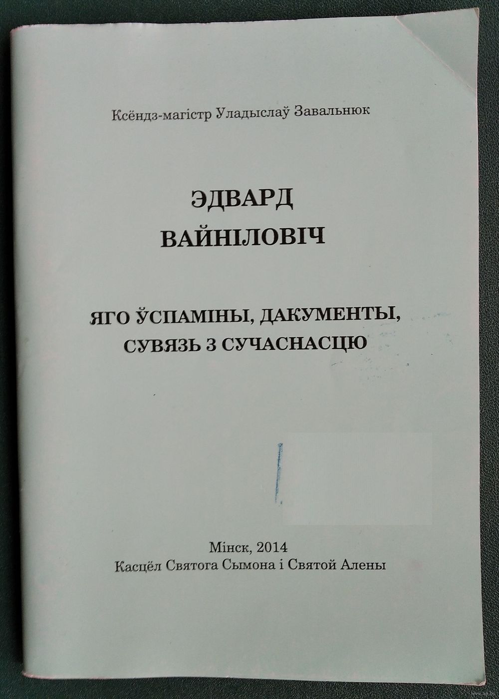 Ксёндз-магістр Уладыслаў Завальнюк. Эдвард Вайніловіч: яго ўспаміны, дакументы, сувязь з сучаснасцю. Мінск : Касцёл Святога Сымона і Святой Алены, 2014 г. 95 с. Мяккая вокладка.