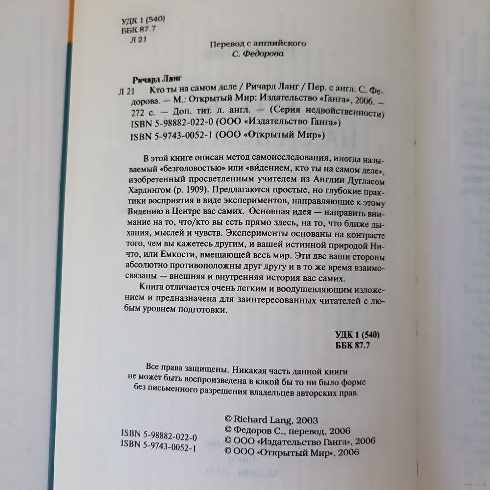 В этой книге описан метод самоисследования, иногда называемый безголовостью или видением, кто ты на самом деле, изобретенный просветленным учителем из Англии Дугласом Хардингом. Предлагаются простые, но глубокие практики восприятия в виде экспериментов, направляющие к этому Видению в Центре вас самих. Основная идея - направить внимание на то, что/кто вы есть прямо здесь, на то, что ближе дыхания, мыслей и чувств. Эксперименты основаны на контрасте того, чем вы кажетесь другим, и вашей истинной природой Ничто, или Емкости, вмещающей весь мир. Эти две ваши стороны абсолютно противоположны друг другу и в то же время взаимосвязаны - внешняя и внутренняя история вас самих
