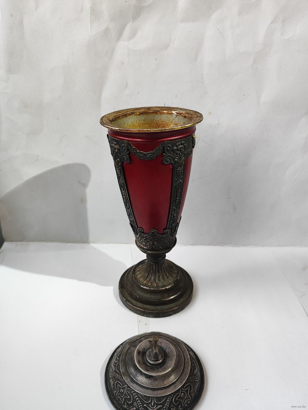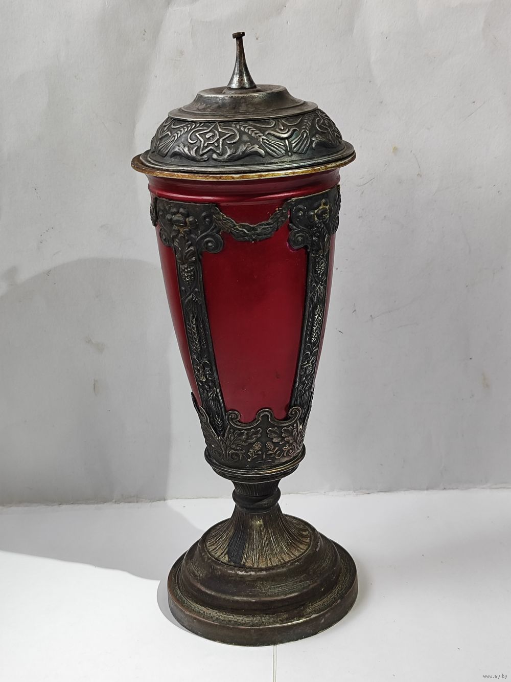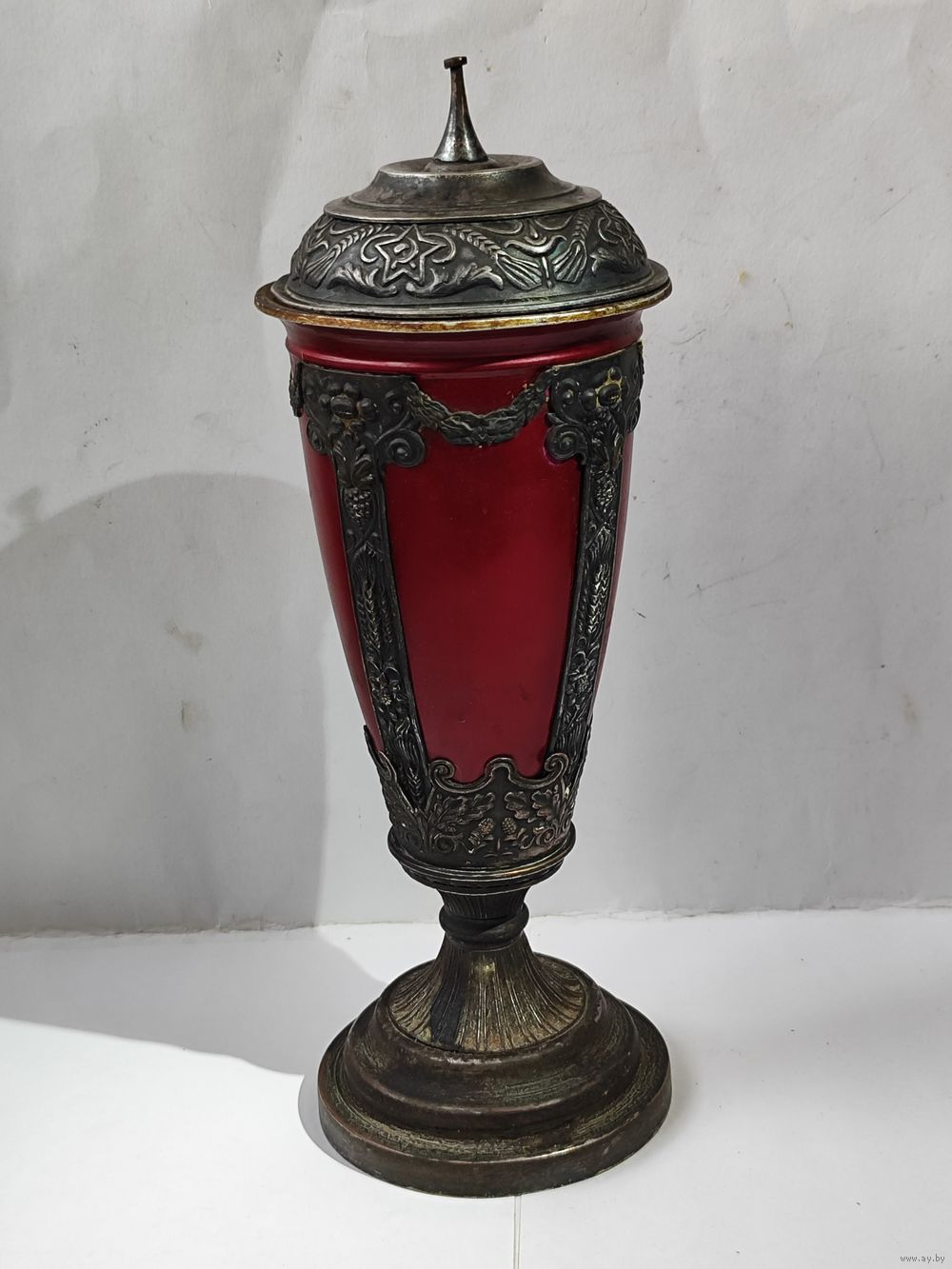 Высота с вершинкой -30 см. 50 -60 годы. Нет навершия на крышке(в виде звезды). На основании и на горлышке остатки старого лака. Состояние на фото(скольчики краски по алюминиевому корпусу, царапинки, пятна.). Надпись на основании(плохо видна из за лака). Коллективу баскетболистов БГУ от коллектива баскетболистов ДГУ(Дагестанский Государственный Университет). март. 1957 г. Закрутка на крышке : з-д Х-ного фонда СССР.