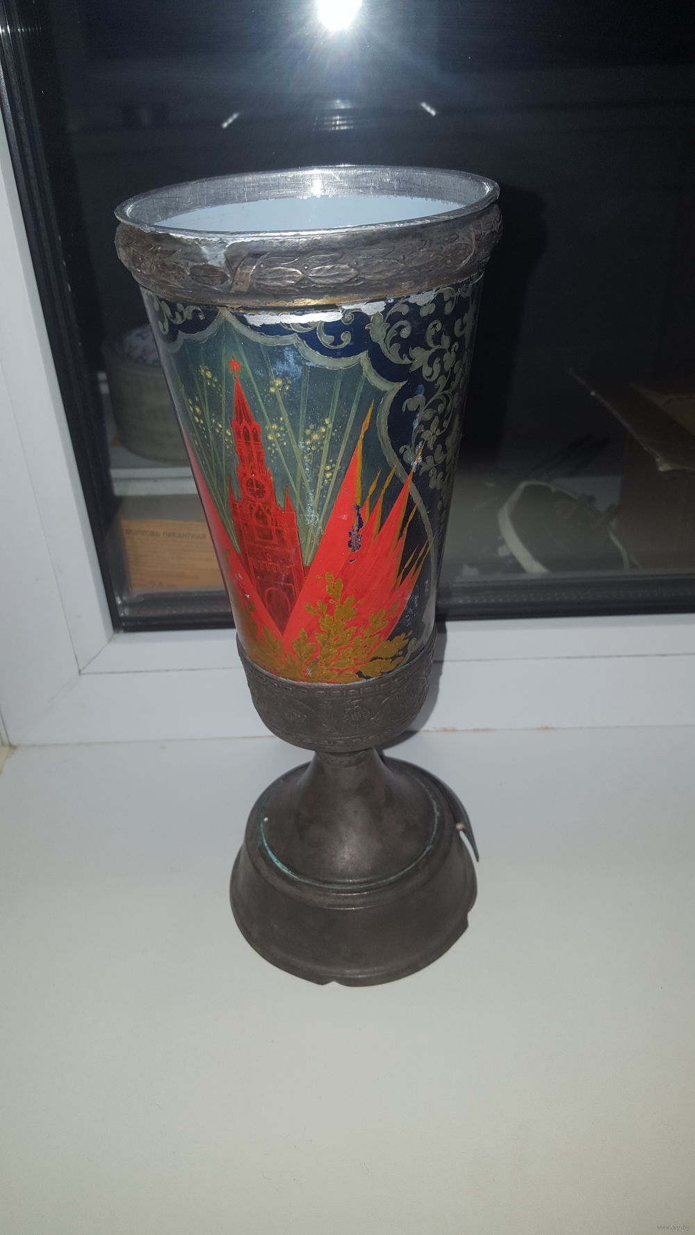 Кубок ссср Кремль. Спасская Башня N634. 1953 год. Палех. Роспись Григорий Михайлович Мельников(1916г.р). Дарственной надписи по сути нет. Через патину проявляется нацарапанная иголкой дата 1961 и буквы неразборчиво ппг(но это не точно).