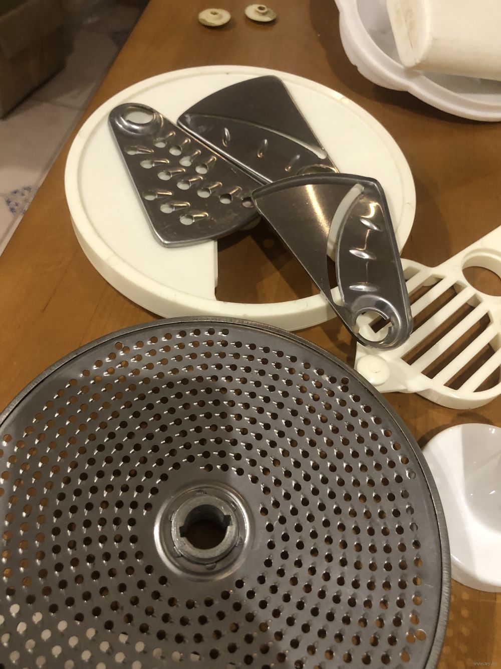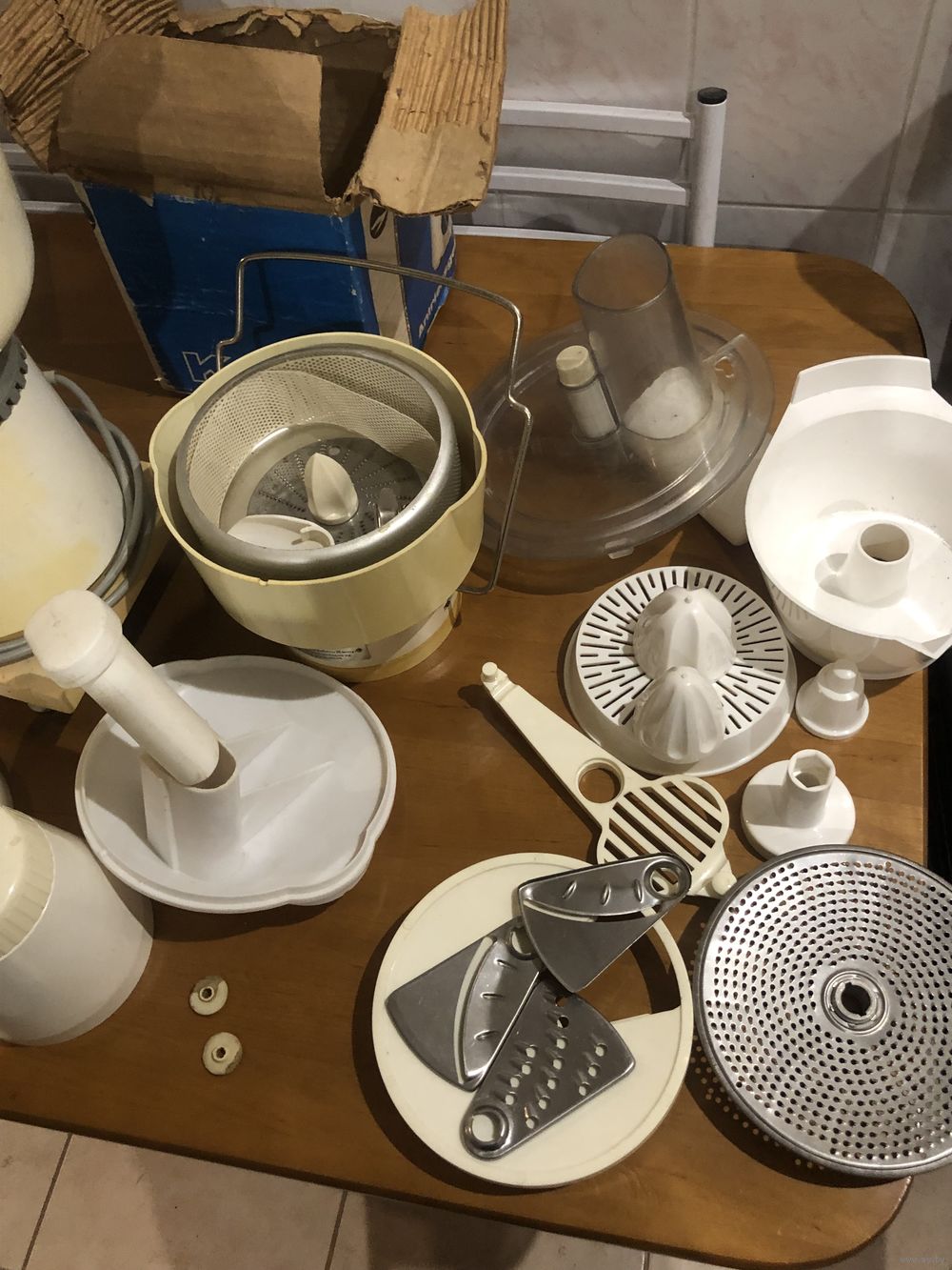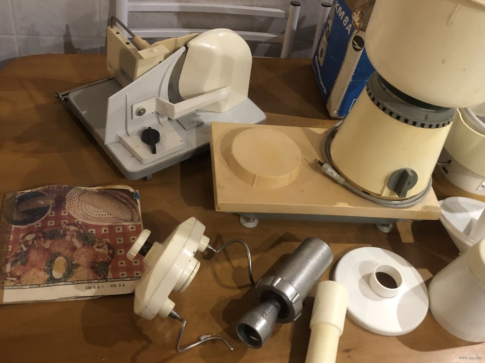 В рабочем состоянии. Паспорт с описанием в наличии. Не хватает только подставки для кофемолки. Так есть все: начиная от мясорубки до нарезки хлеба и колбасы. Соки, напитки, пюре, драники и т.д.