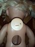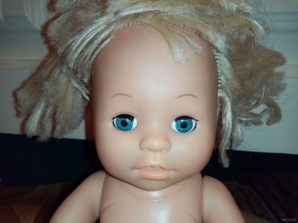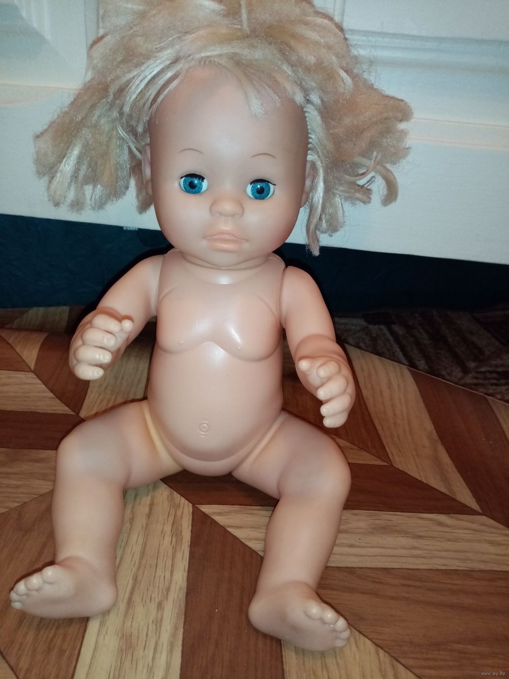 В горизонтальном положении, глазки закрываются. электронный блок с динамиком проверить нет возможности, нет батареек 3шт, (типа таблетка) скорее всего не работает, продается, как есть. Без одежек. Сколов и трещин нет.