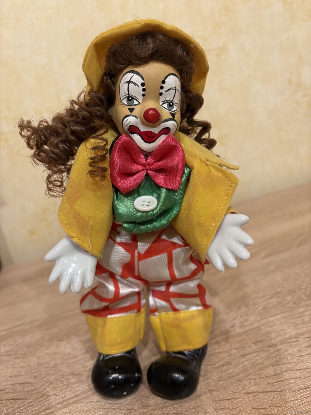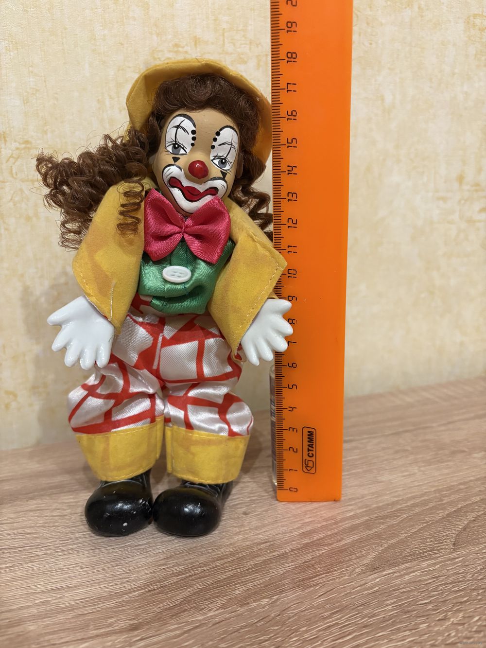 Коллекционная фигурка клоуна с фарфоровыми элементами.Руки-ноги гнутся,клоун может стоять и сидеть