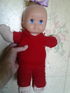 34 см. Упругий малыш, с очень красивыми глазами. Красный комбез по всей видимости - не родной. Внутри чистенький. Недостаток - есть потери волосиков, не очень заметно.