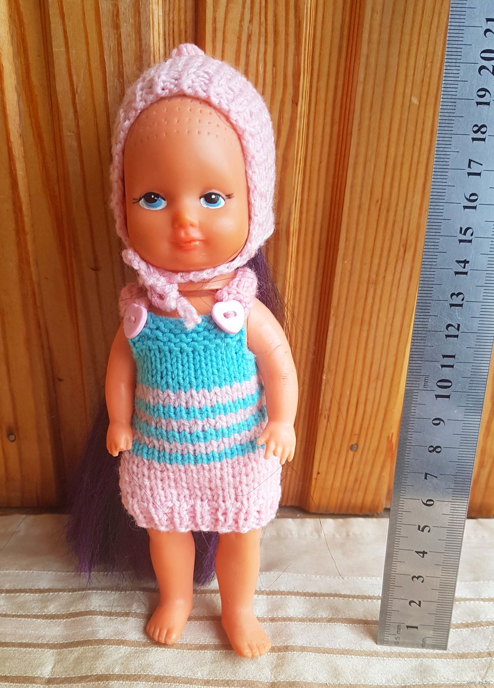 Куколка одета в одежду ручной работы с незаконченной прошивкой волос.