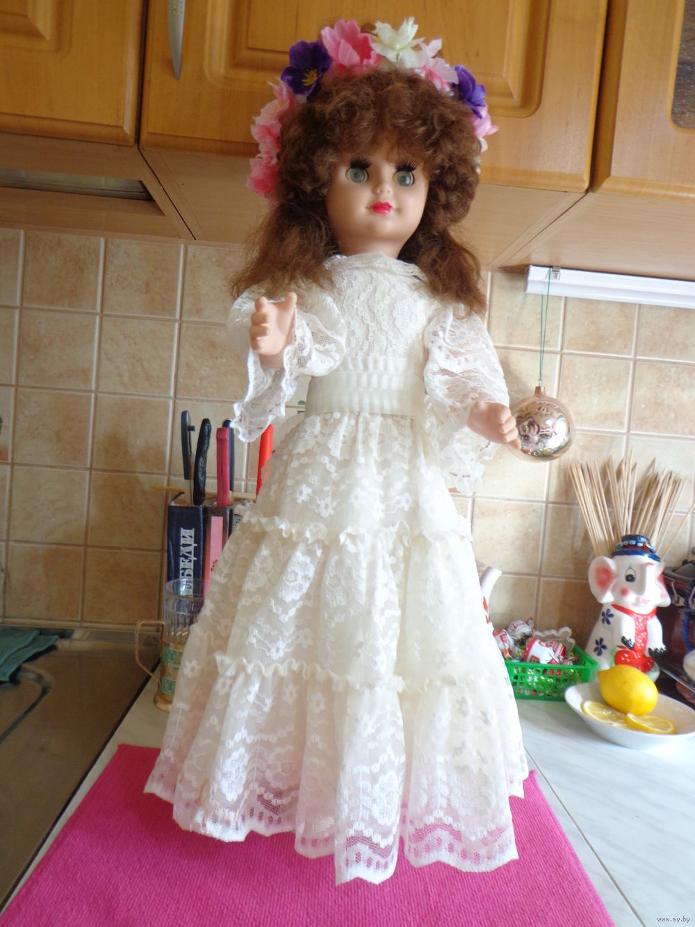 | Оригинал. Одежда, нижнее белье, обувь- все оригинал. Без проплешин, сидит, моргает. Когда-то пару раз проехала на свадьбе , на капоте, сервантное хранение. | |