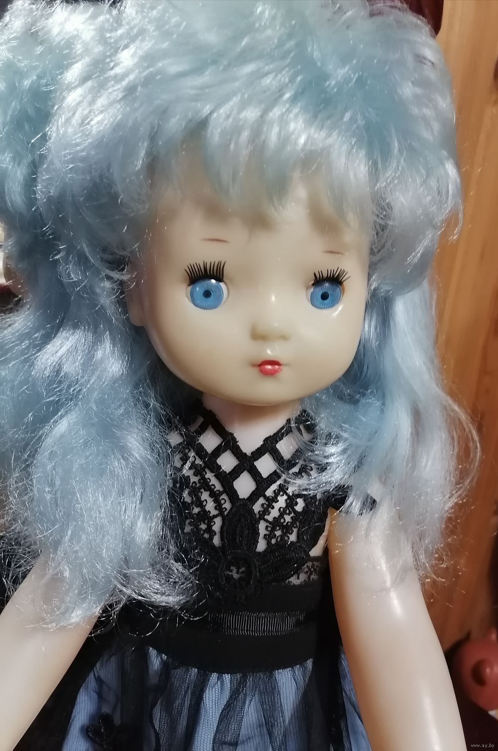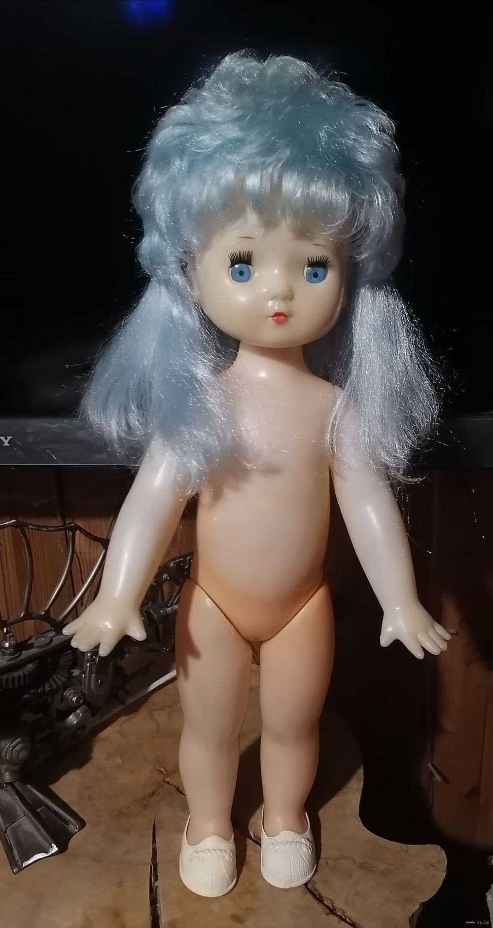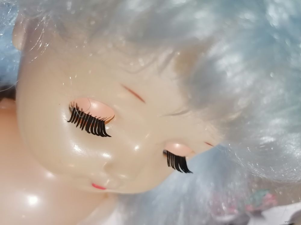 Очень густые и длинные волосы, ясные глазки. На резинках только ручки, остальное диски.