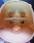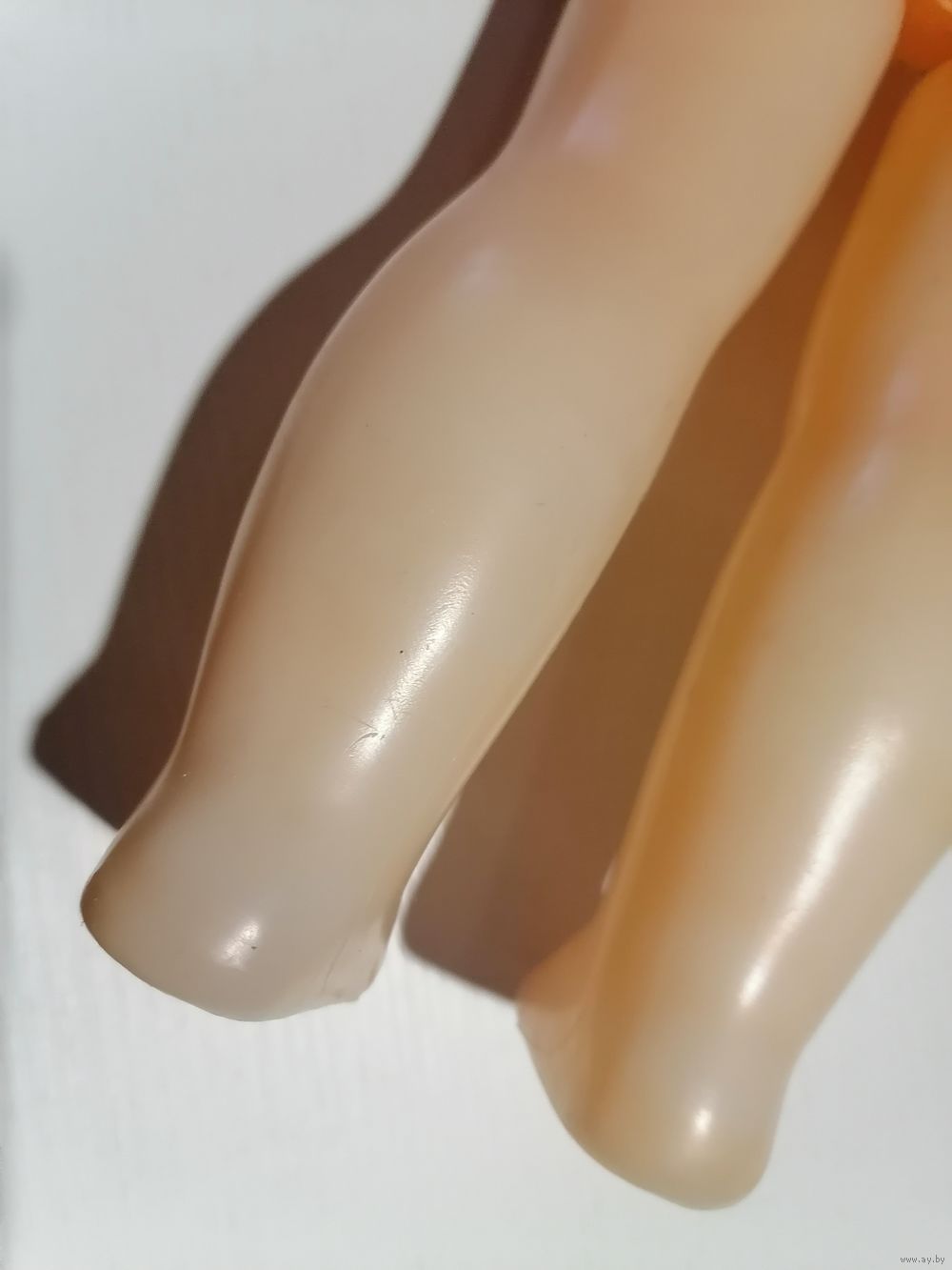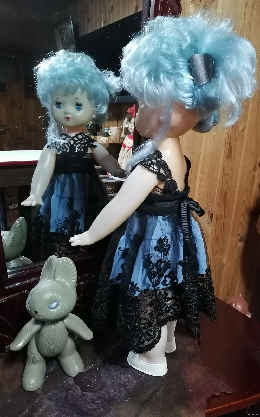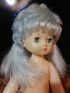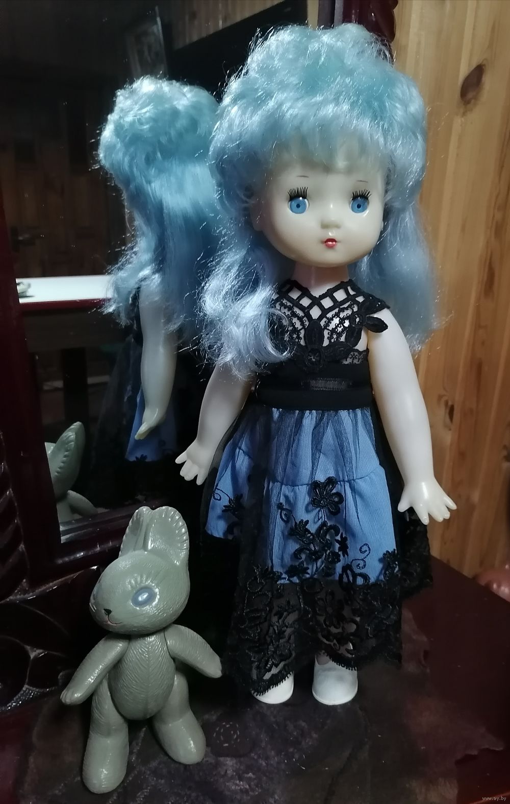 Очень густые и длинные волосы, ясные глазки. На резинках только ручки, остальное диски.