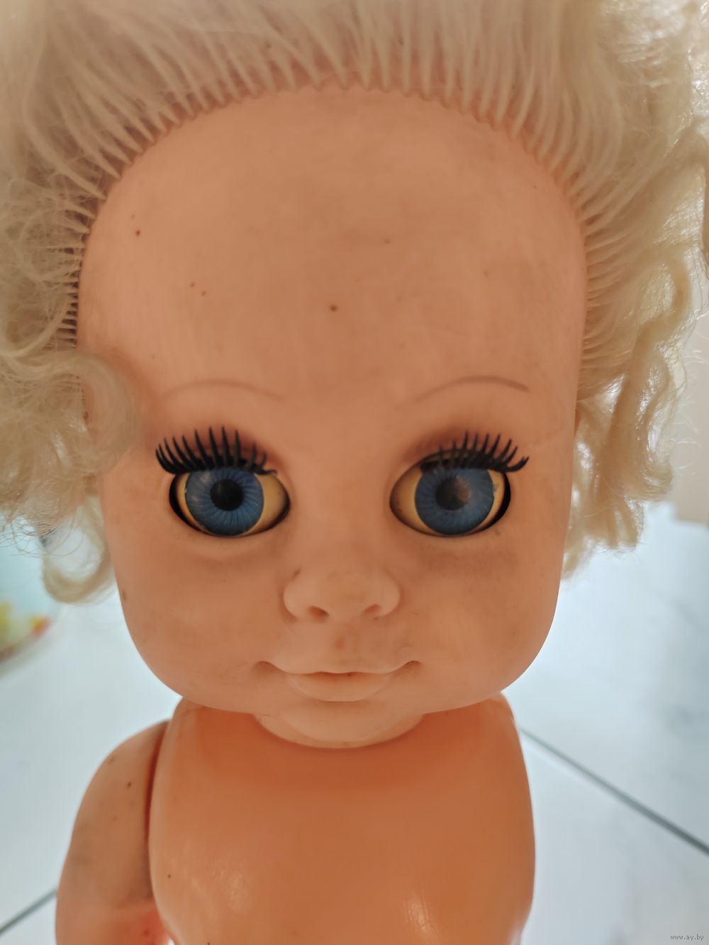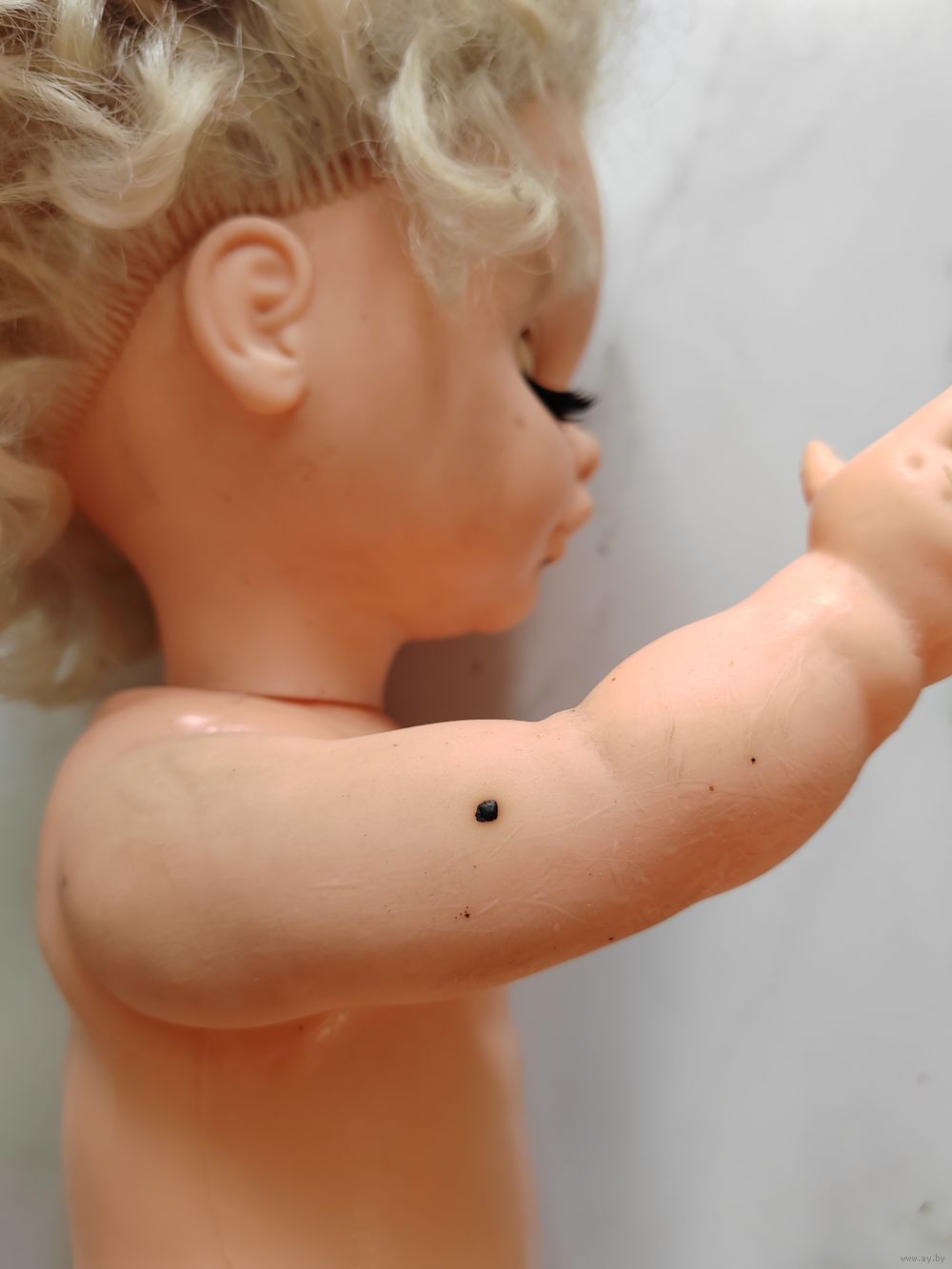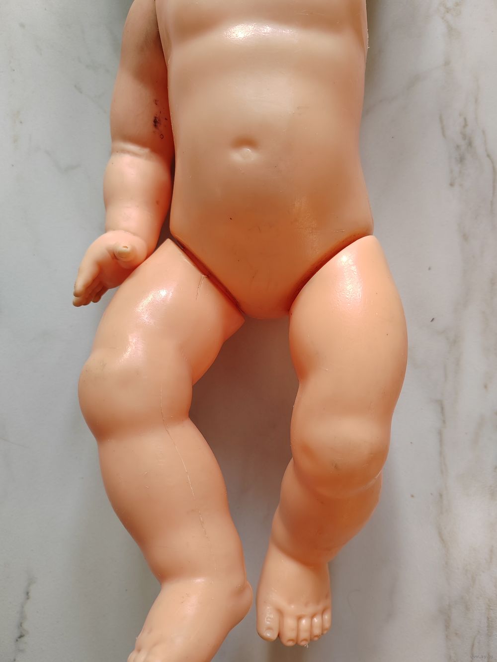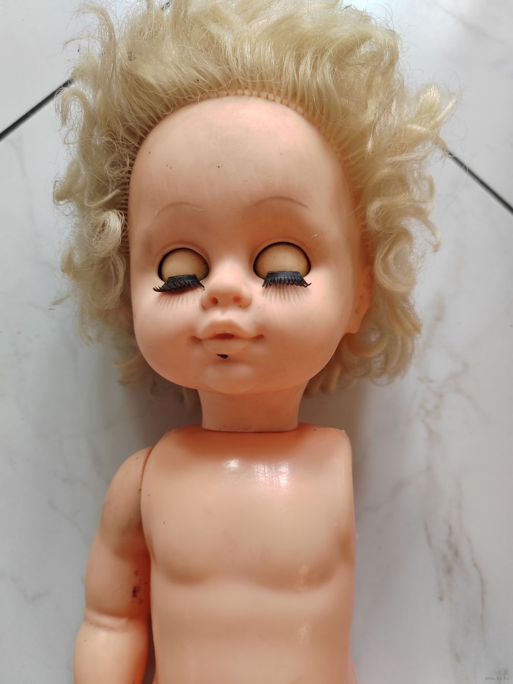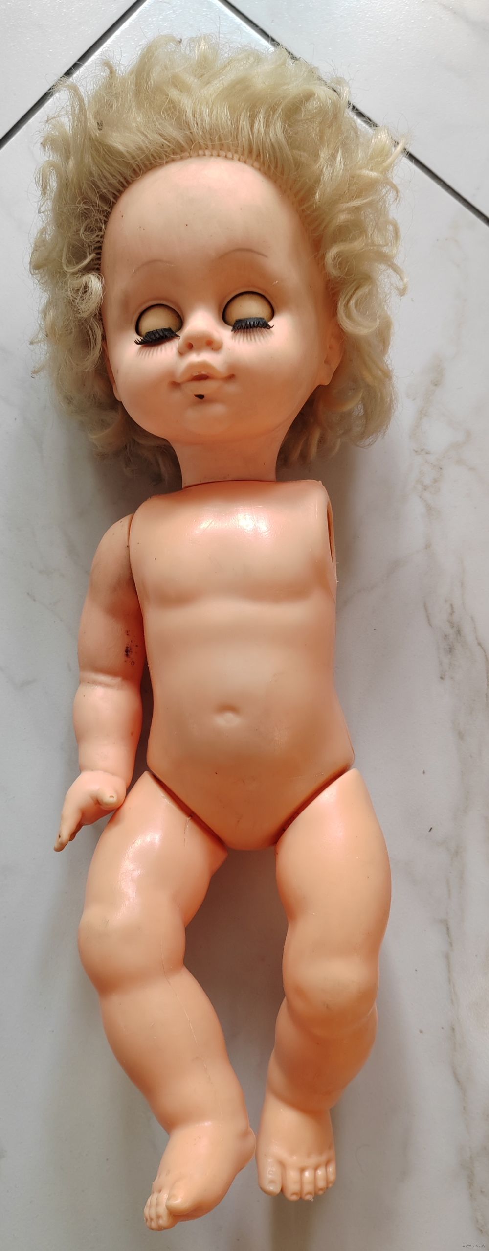 Голова, рука резиновые. Тело, ноги пластиковые. Глаза открываются.