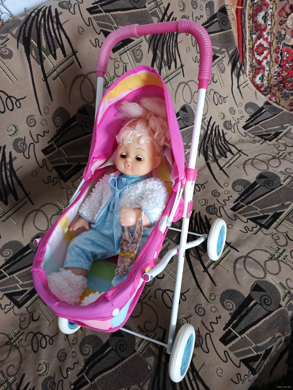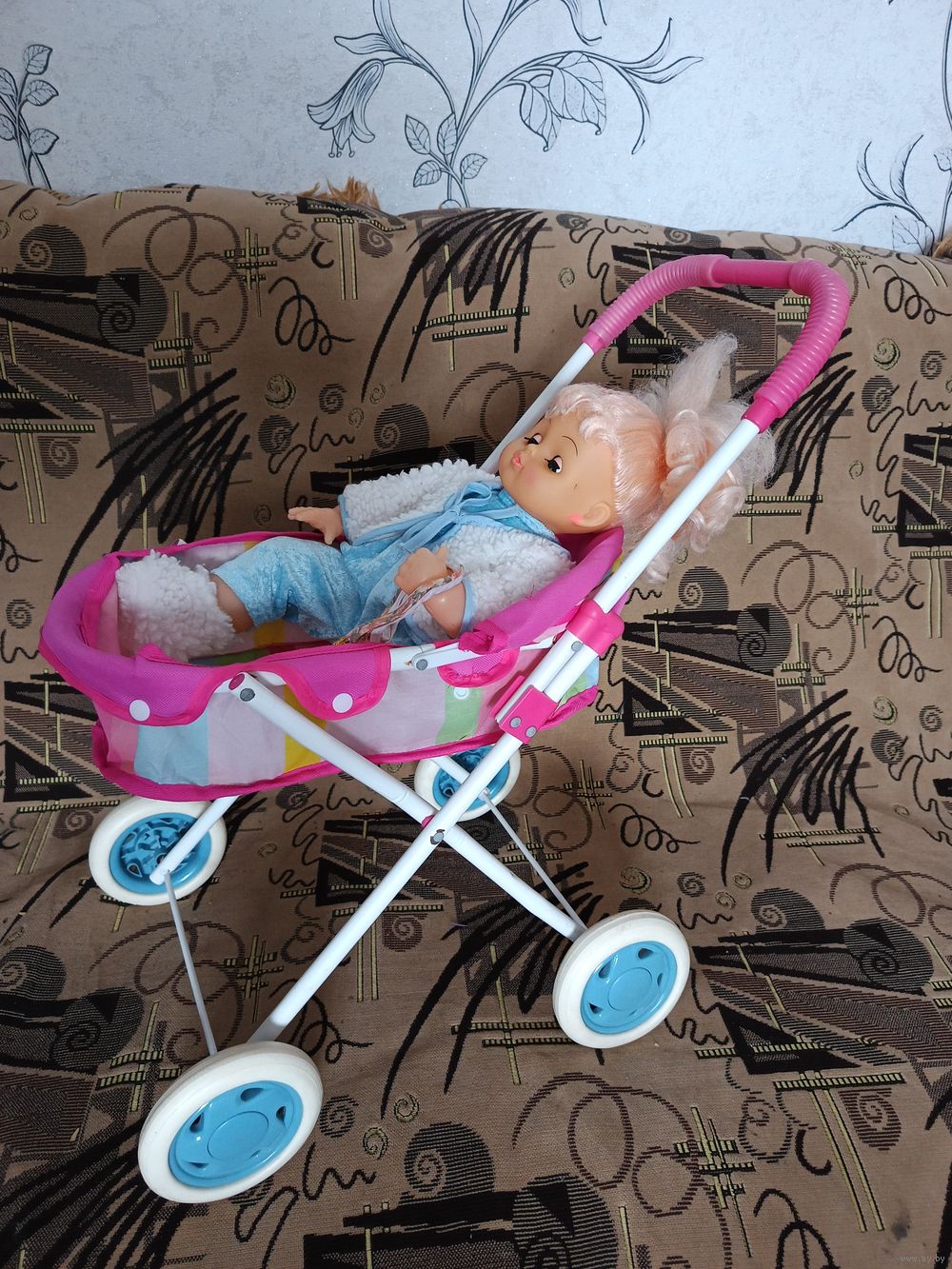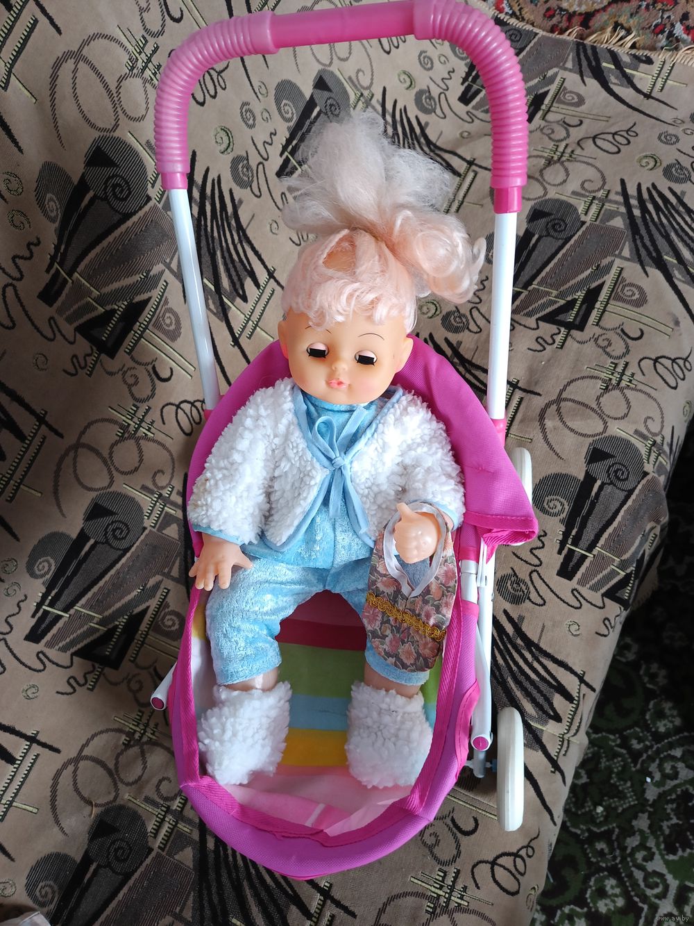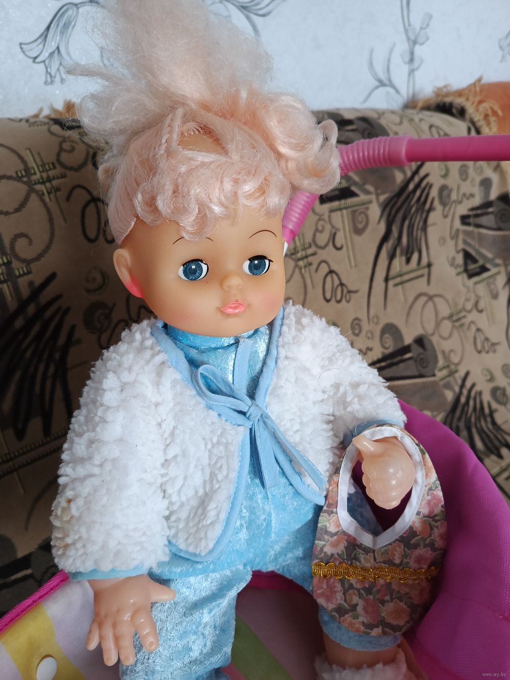 Рост куклы 38 см, глазки закрываются когда кукла лежит, тело, ручки ножки и голова из пластмассы. Ручки, ножки и голова двигаются. Кофточка, одежда и тапочки у куклы снимаются. Кукла и коляска в хорошем состоянии.