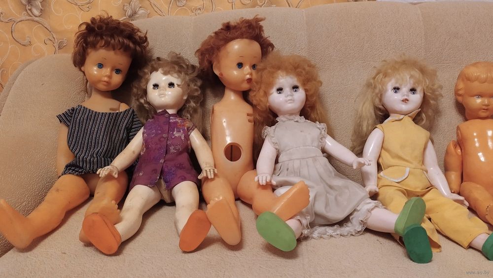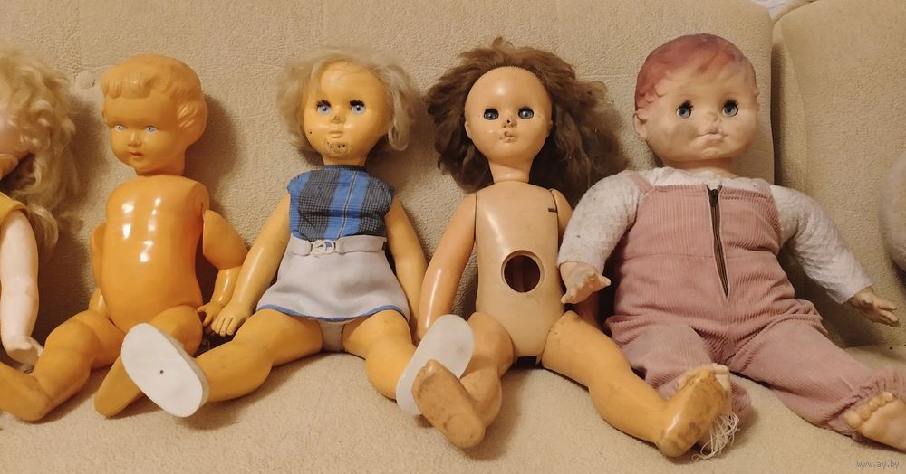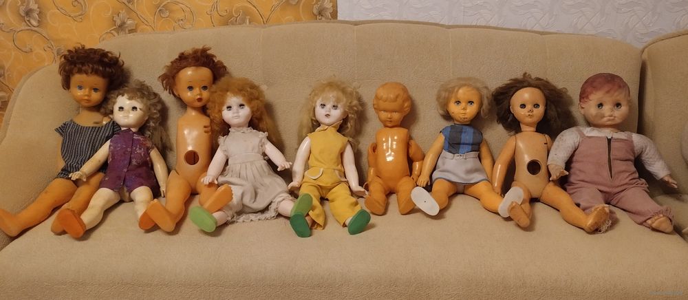 Все куклы времён СССР. Есть небольшие дефекты. К третьей слева руки есть. У целлулоидной есть трещина на голове по шву.