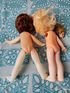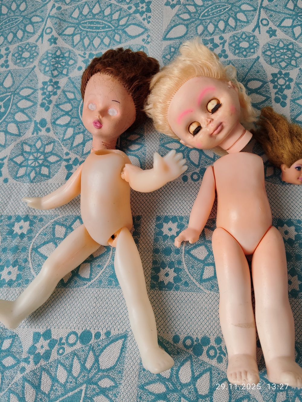 Одно туловище пластмасса на резинках, второе тоже, одна ручка из мягкой резины. Длина туловища 23-24 см.
