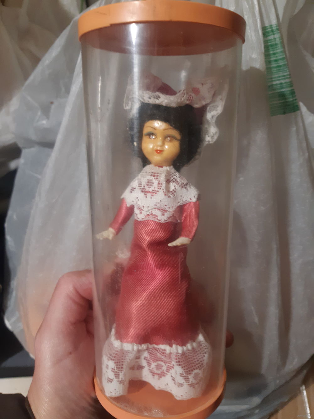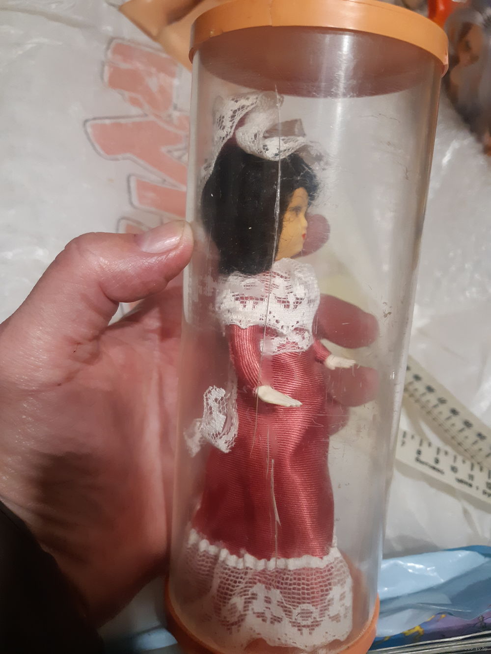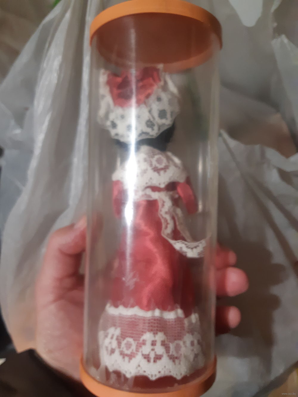 Сам тубус высотой примерно 19 см. Куколка из колкого пластика, крышечка приклеена, не достаю. Одна ножка приклеена к основанию,видимо, вторая чуть повыше, но ничего не подомано, осколков нет. Интересная, всё родное у нее.