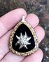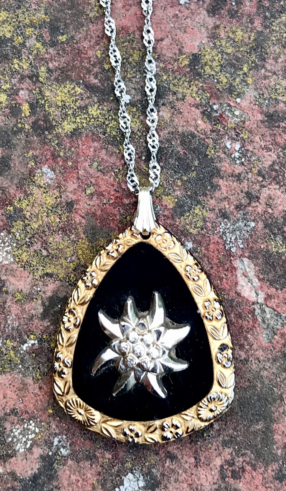 Винтажный кулон из стекла чёрного цвета, по краям золочение, лицевая сторона украшена накладкой в виде цветка эдельвейса из металла серебристого тона. С обратной стороны на уголке небольшой скол. Высота кулона с петлей 3,7см., размер подвески 3,3х2,7см.