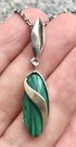 Кулон с основой из серебра (отметок нет, проверено в юв.мастерской) и вставкой из малахита. На лицевой стороне элемент с позолотой. Высота кулона с петлей 4,3см., размер вставки 1,9х0,3см. Состояние хорошее.