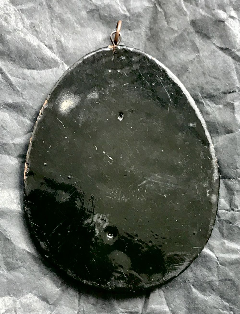 Винтажный кулон в технике лаковая миниатюра. Высота с петлей 6,5см. С обратной стороны и по краю кулона есть несколько незначительных потёртостей. Общее состояние хорошее.
