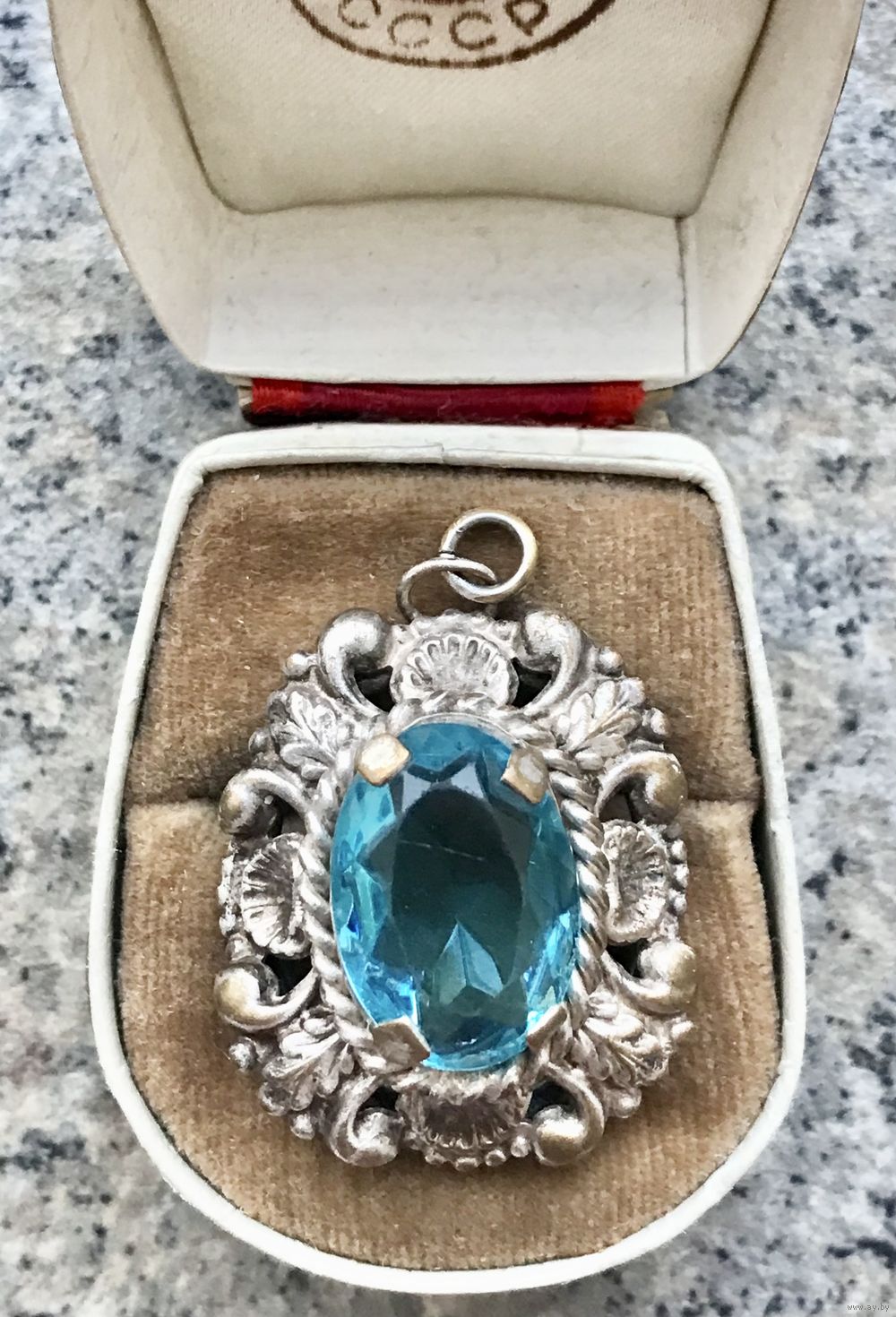 Винтажный кулон из Франции с основой из латуни с серебрением (местами имеются потёртости) и вставкой из стекла аквамаринового цвета (на вставке имеется царапина). Высота кулона с петлей 3,6см., размер подвески 3,4х2,2см., размер вставки 1,8х1,4см. Все нюансы учтены в цене.