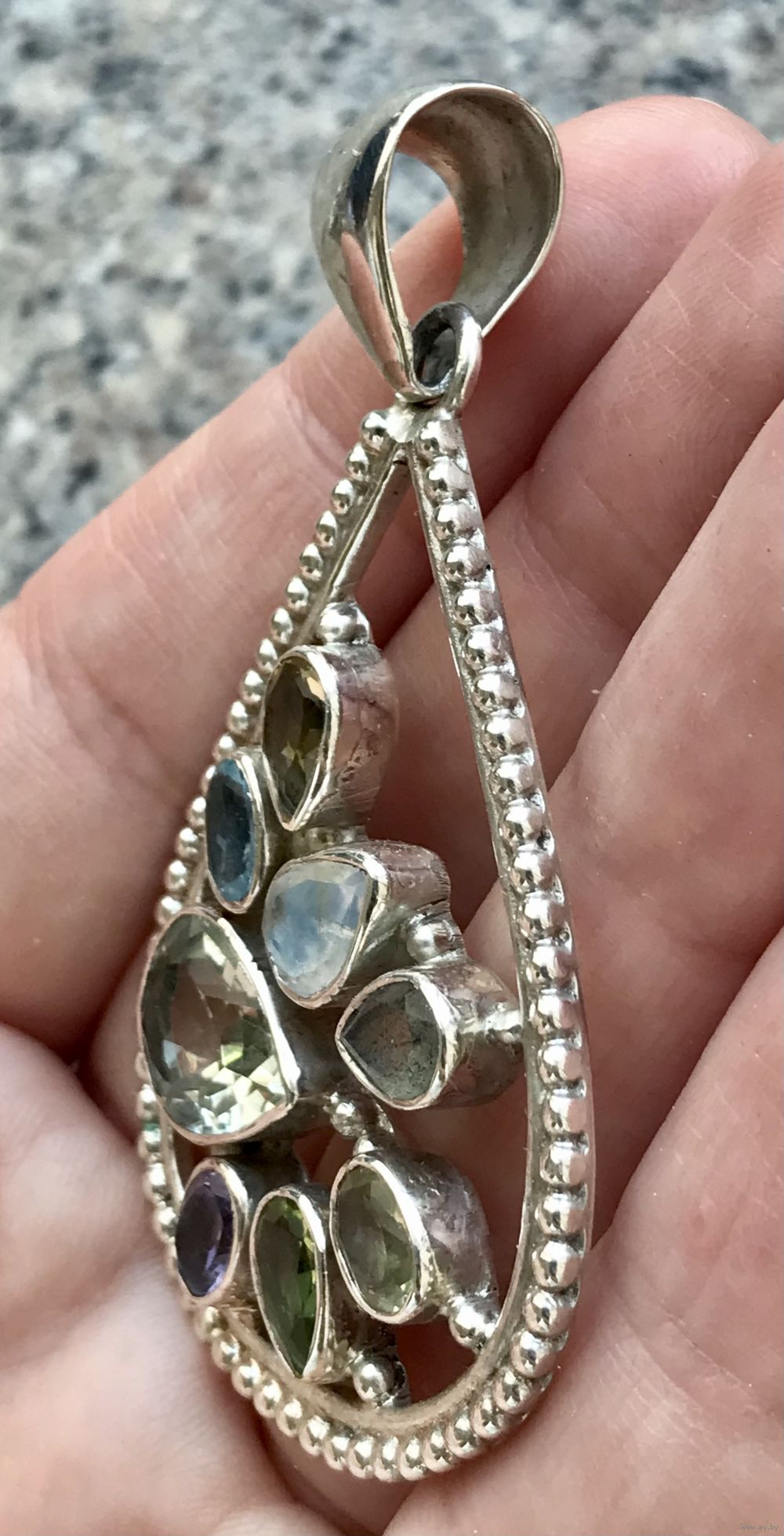 Крупный кулон из индийского серебра и вставок из камней. Высота кулона с петлей 6,5см., размер капли 5,5х3,5см. Состояние хорошее.