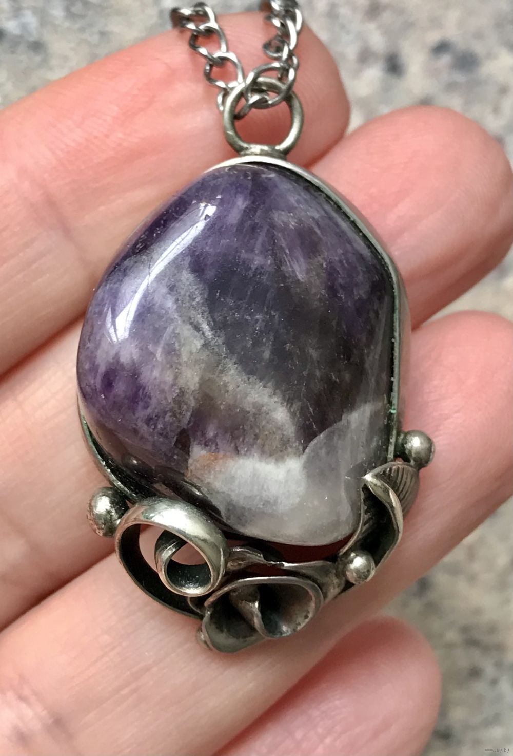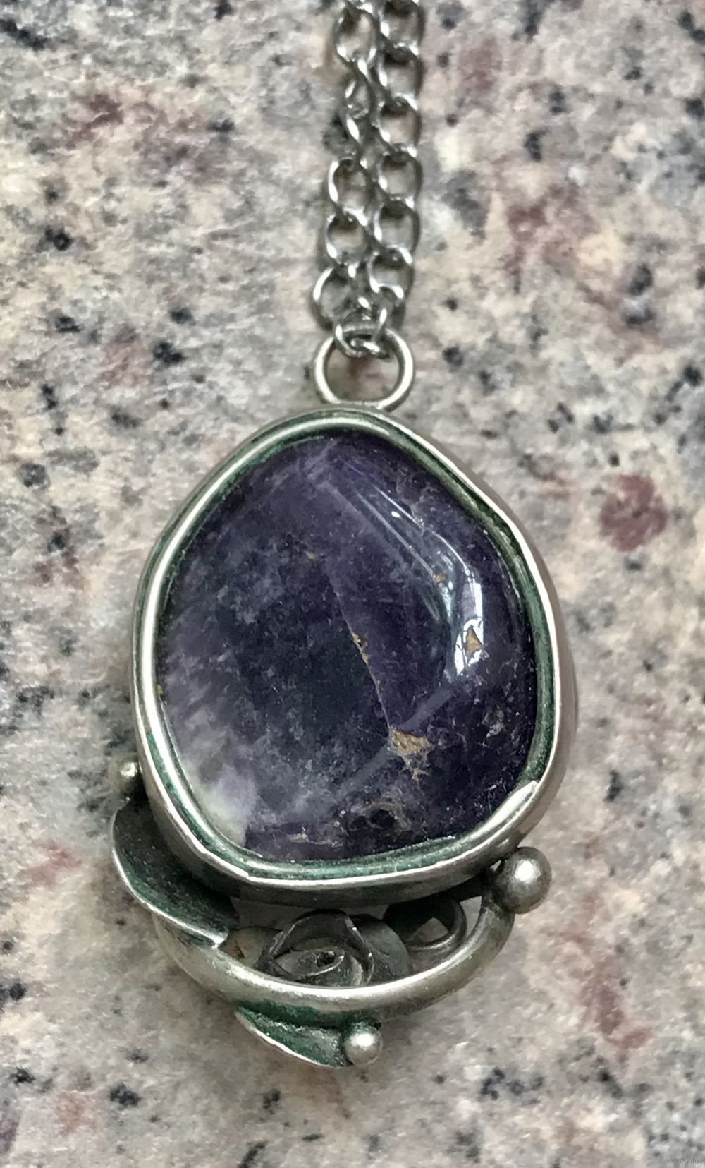 Кулон с основой из мельхиора, вставка аметист. Высота с петлей 4,3см., ширина 2см. Состояние хорошее.