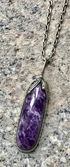Кулон, переделанный из винтажной серьги с основой из мельхиора и вставкой из чароита. Высота с петлей 4,7см., размер вставки 3,5х1см.