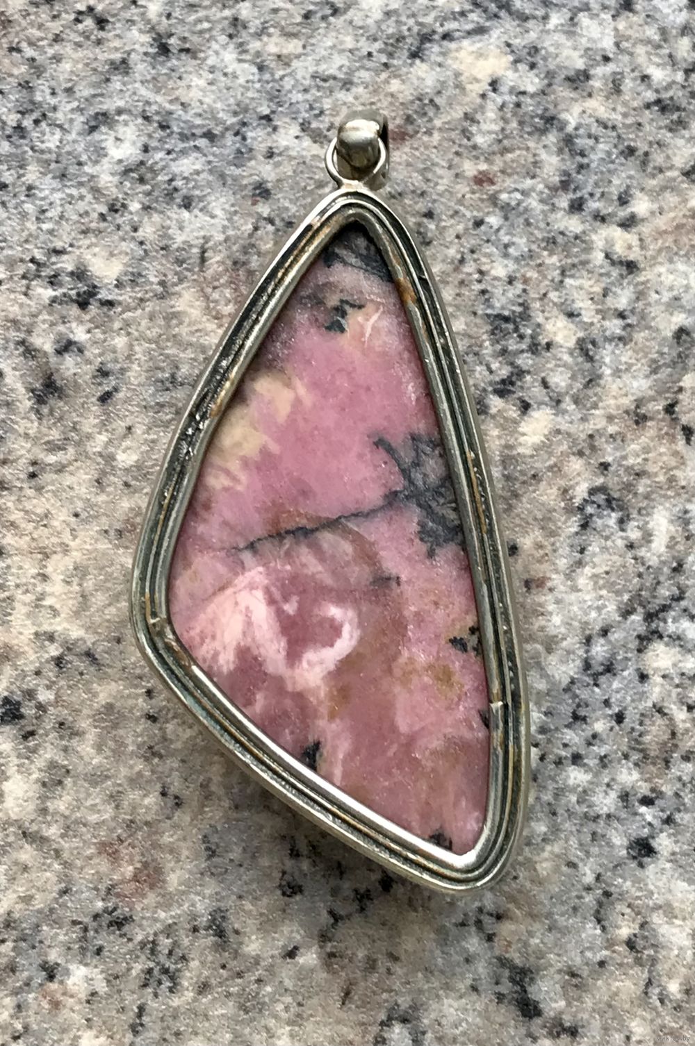 Крупный кулон с основой из мельхиора и вставкой из родонита. Высота кулона с петлей 6,5см., размер вставки 5,5х3х1,5см. Состояние хорошее.