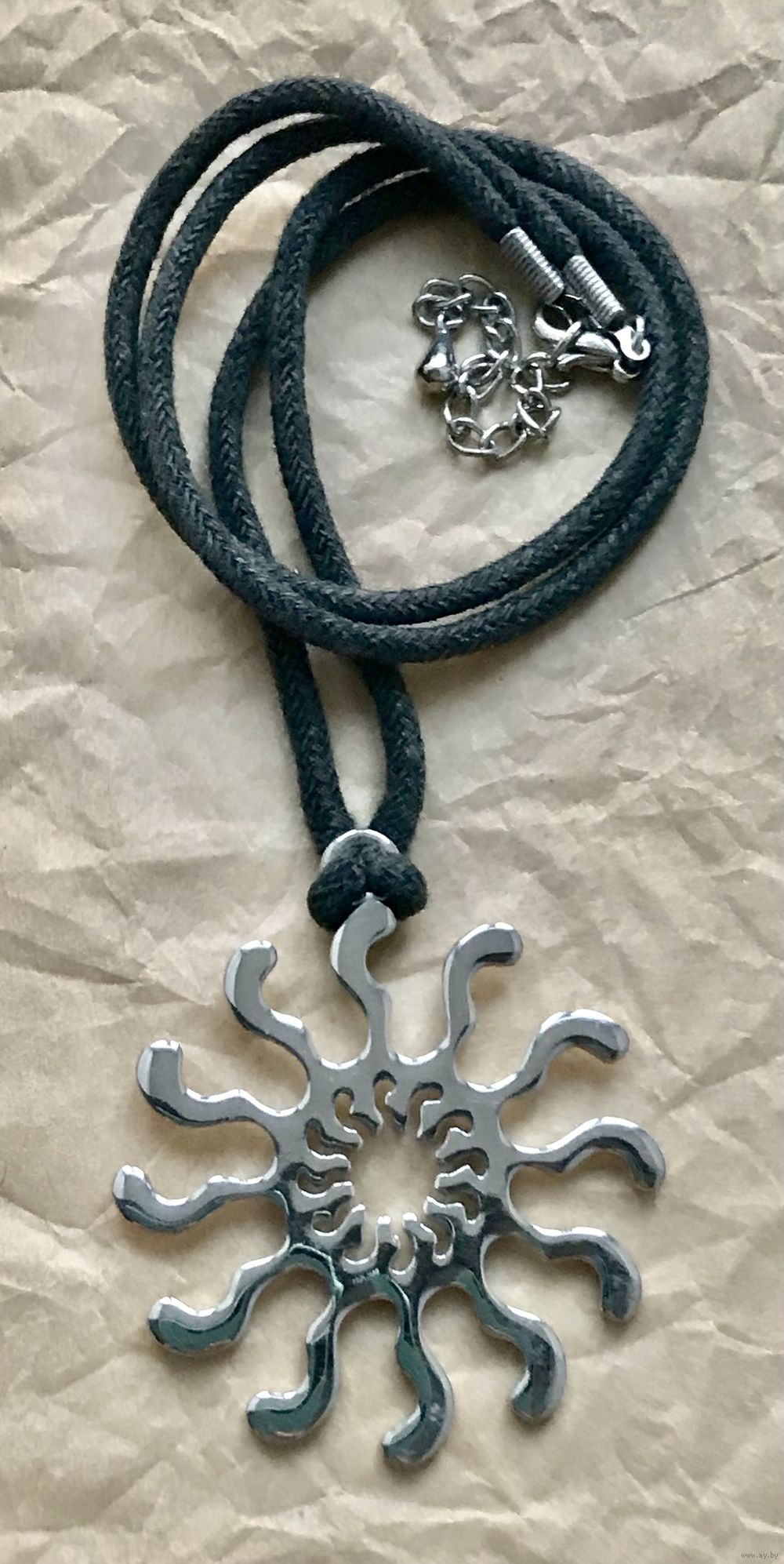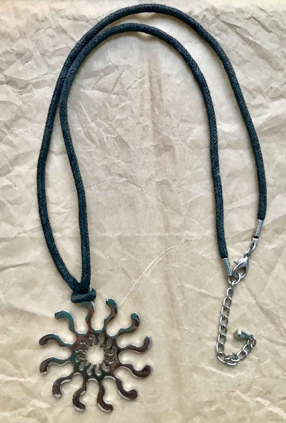 Кулон из стали на текстильном шнурке. Диаметр 4,5см., длина шнурка 52см. Состояние хорошее.