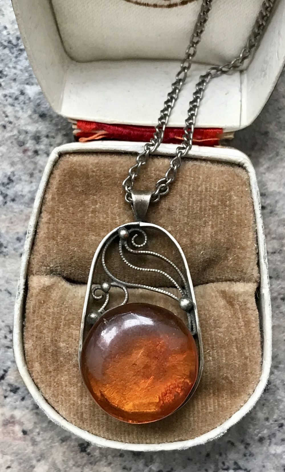 Винтажный кулон с основой из мельхиора, вставка из янтаря. Высота кулона с петлей 3,5см., диаметр вставки 1,7см. Кулон на цепочке из металла, длина цепочки 76см. Состояние хорошее.