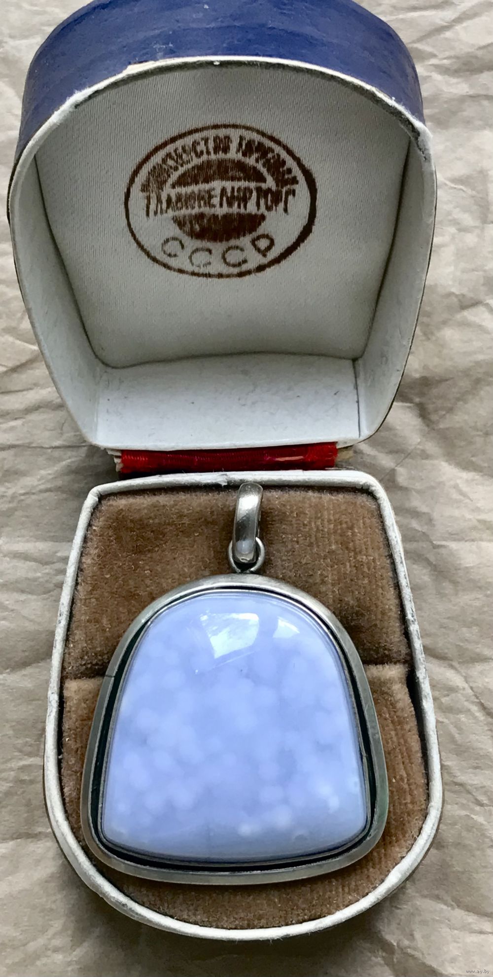 Крупный кулон с основой из мельхиора и вставкой из голубого агата. Высота с петлей 4см., высота вставки 2,6см., ширина от 1,5см. до 2,6см. Состояние хорошее.