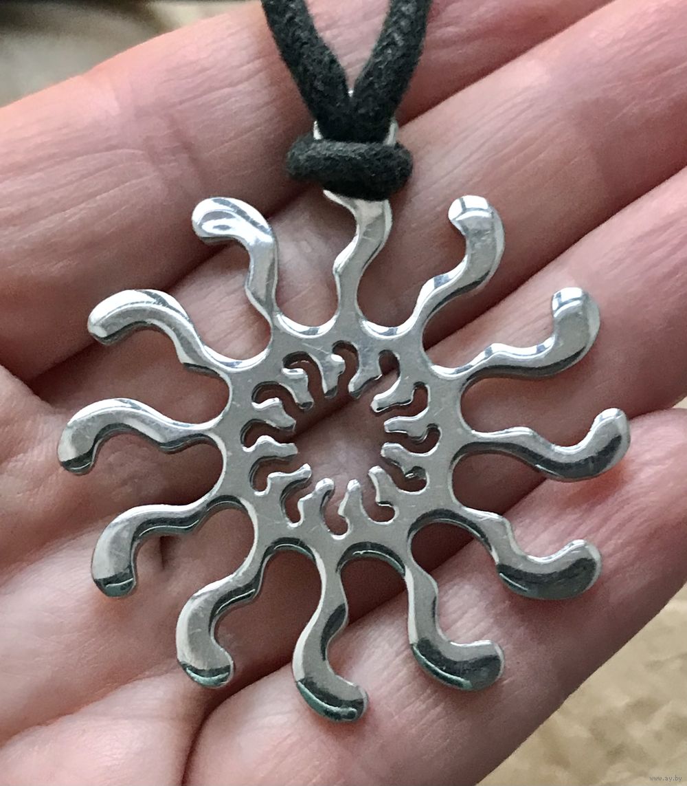Кулон из стали на текстильном шнурке. Диаметр 4,5см., длина шнурка 52см. Состояние хорошее.