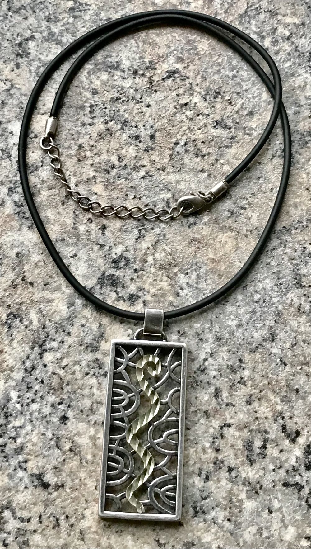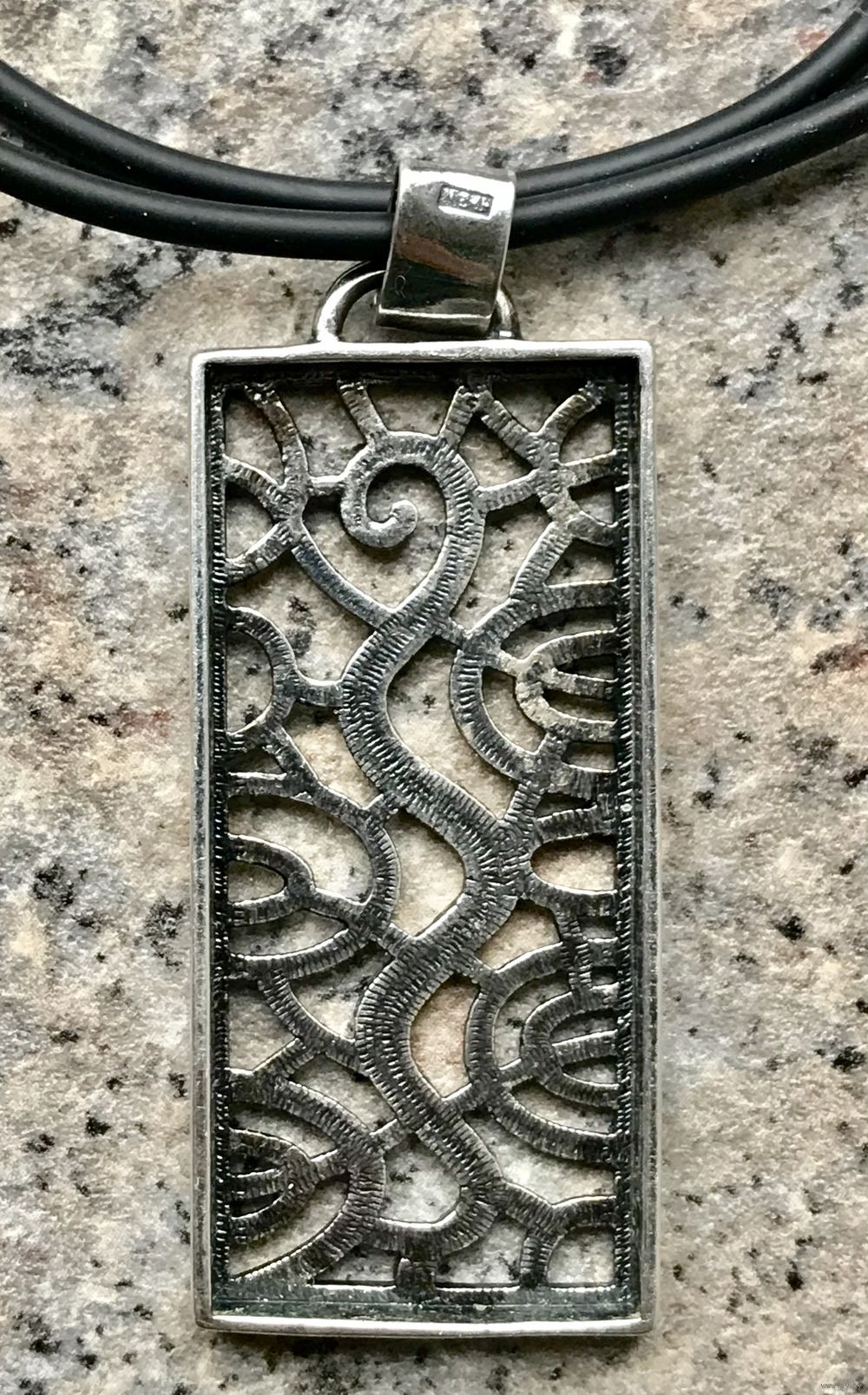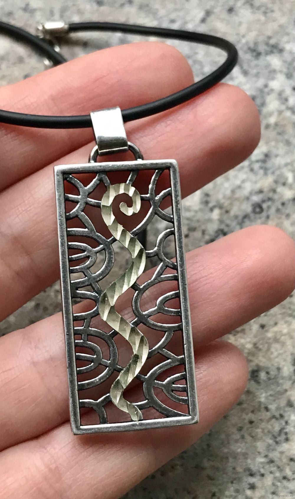 Крупный кулон из мельхиора с серебрением (клеймо) на резиновом шнурке. Высота кулона с петлей 5см., ширина 2см., длина шнурка 39см+5см. доп.цепочка. Состояние хорошее.
