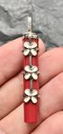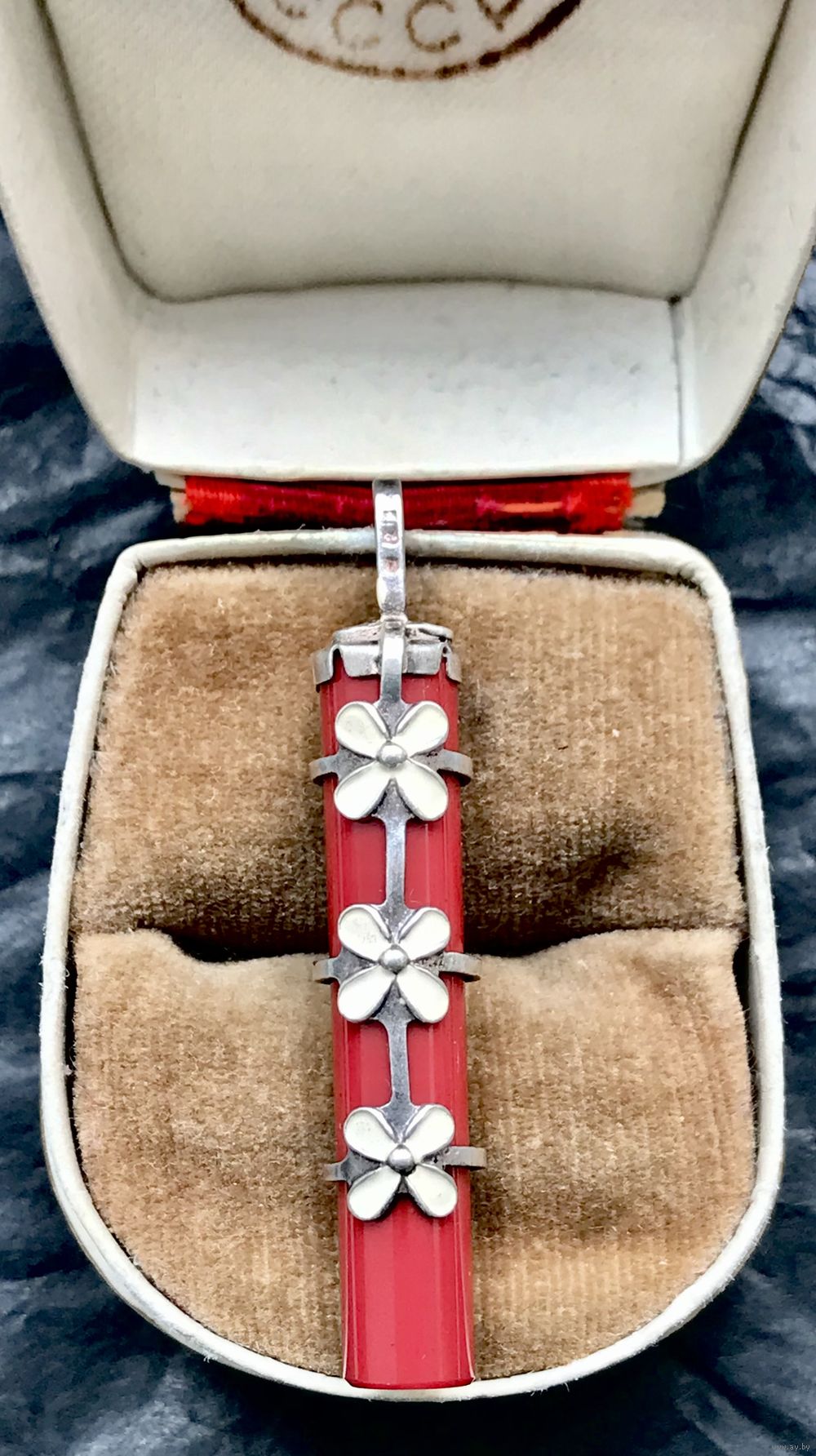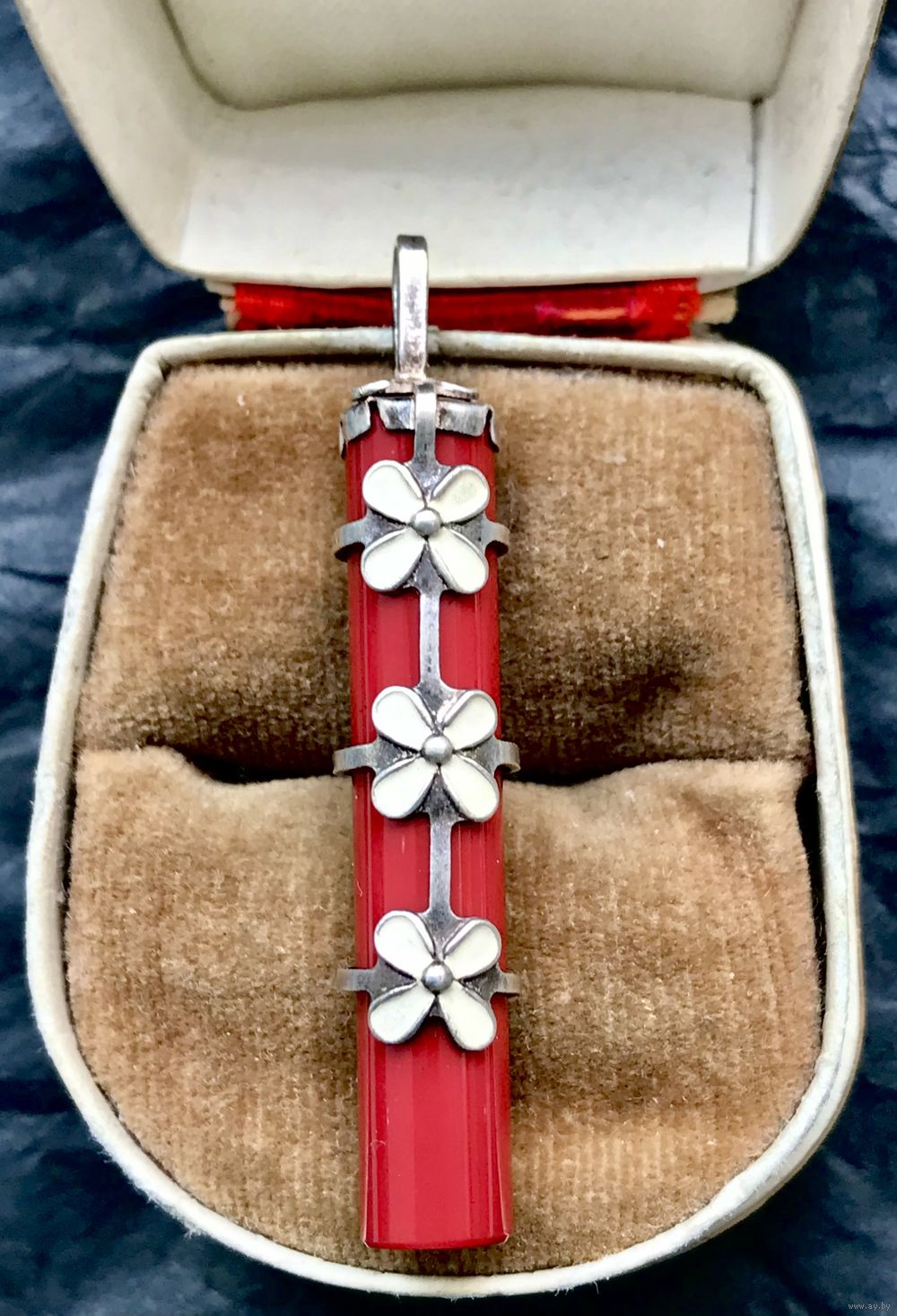 Кулон из цветного стекла насыщенного красного цвета, декорирован накладкой из мельхиора, цветочки покрыты эмалью. Высота кулона с петлей 4,8см. Состояние хорошее.