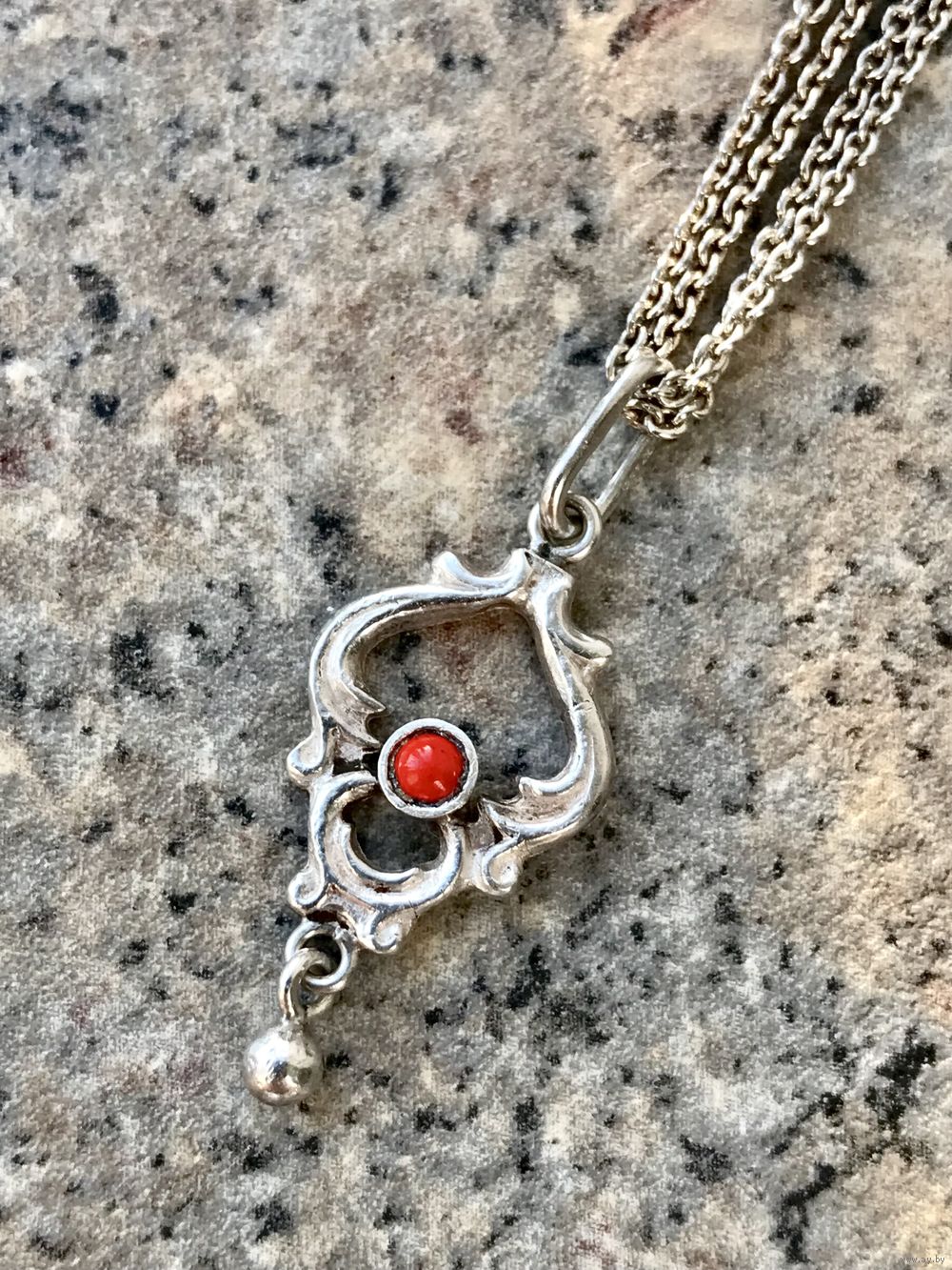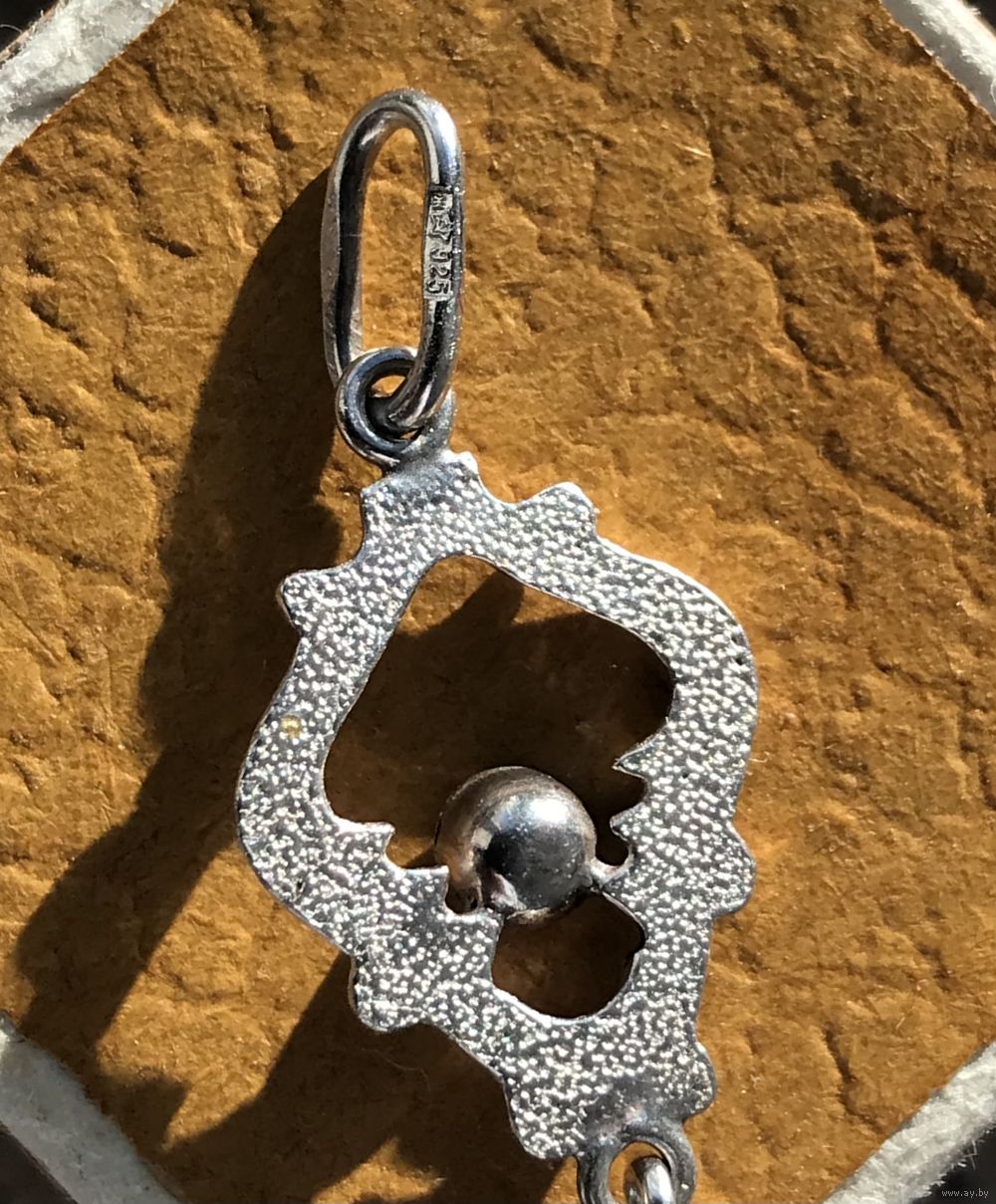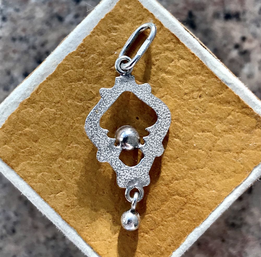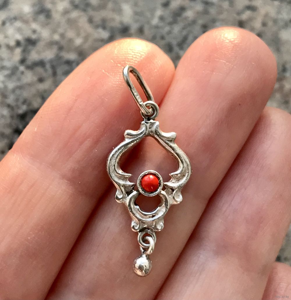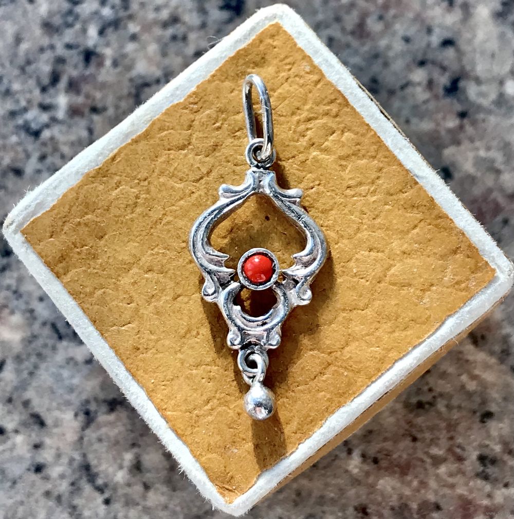Миниатюрный кулон из серебра 925пр.(звезда), изготовлен в 90-е на Предприятии художественных изделий «Ула» в г.Друскининкай. Вставка из смальты оранжево-красного цвета. Высота кулона с петлей 3см., ширина 1,2см. Состояние хорошее.