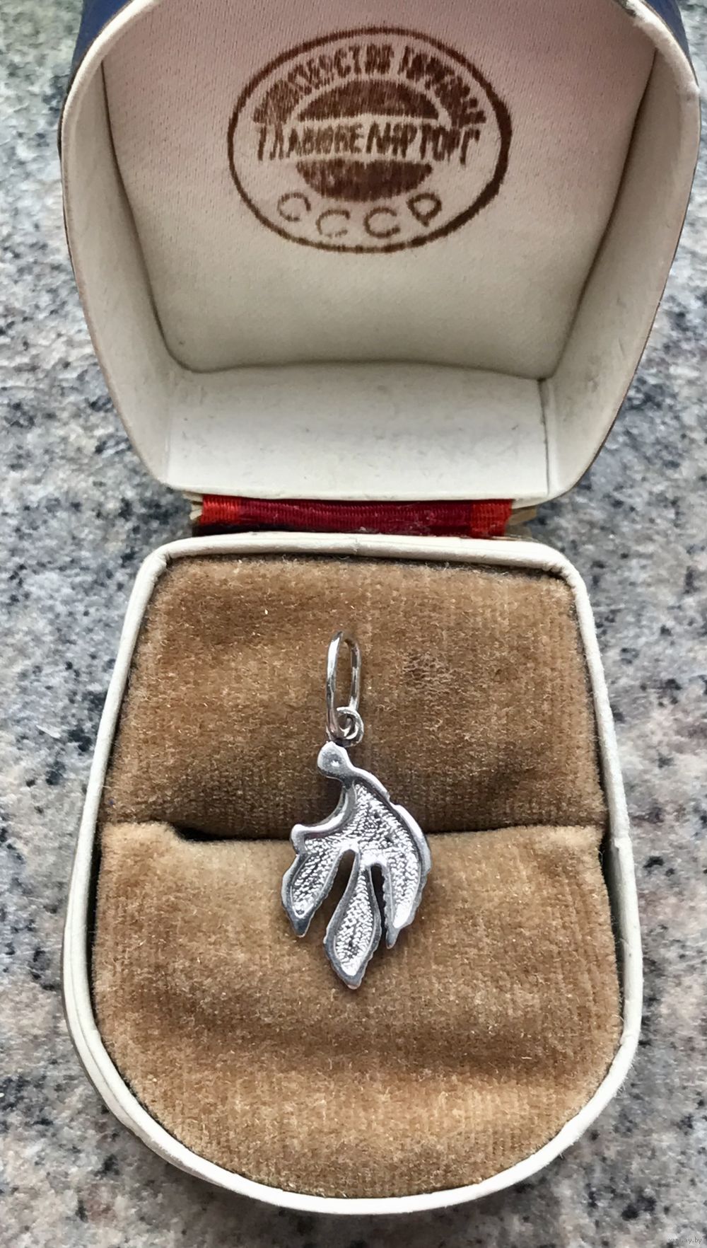 Миниатюрный кулон из серебра 925пр. (стоит российское клеймо и пробирное с зубром). Высота кулона с петлей 3,5см., размер листочка 2х1см. Состояние хорошее.