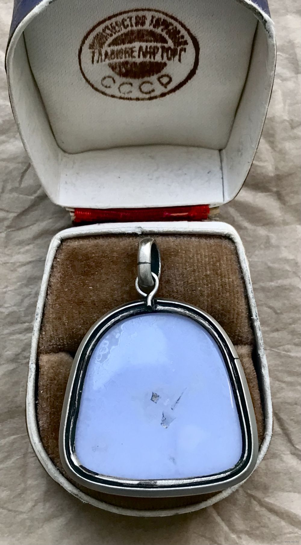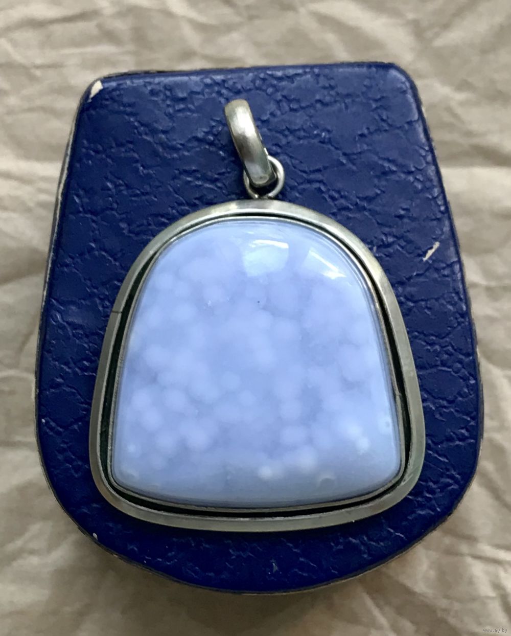 Крупный кулон с основой из мельхиора и вставкой из голубого агата. Высота с петлей 4см., высота вставки 2,6см., ширина от 1,5см. до 2,6см. Состояние хорошее.