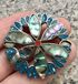 Винтажный кулон с основой из сплава alpaca, лицевая сторона украшена пластинами гелиотиса и вставками бирюзовой крошки (не хватает двух вставок, учтено в цене). Диаметр цветка 4см. Сделано в Мексике. Можно носить как брошь.