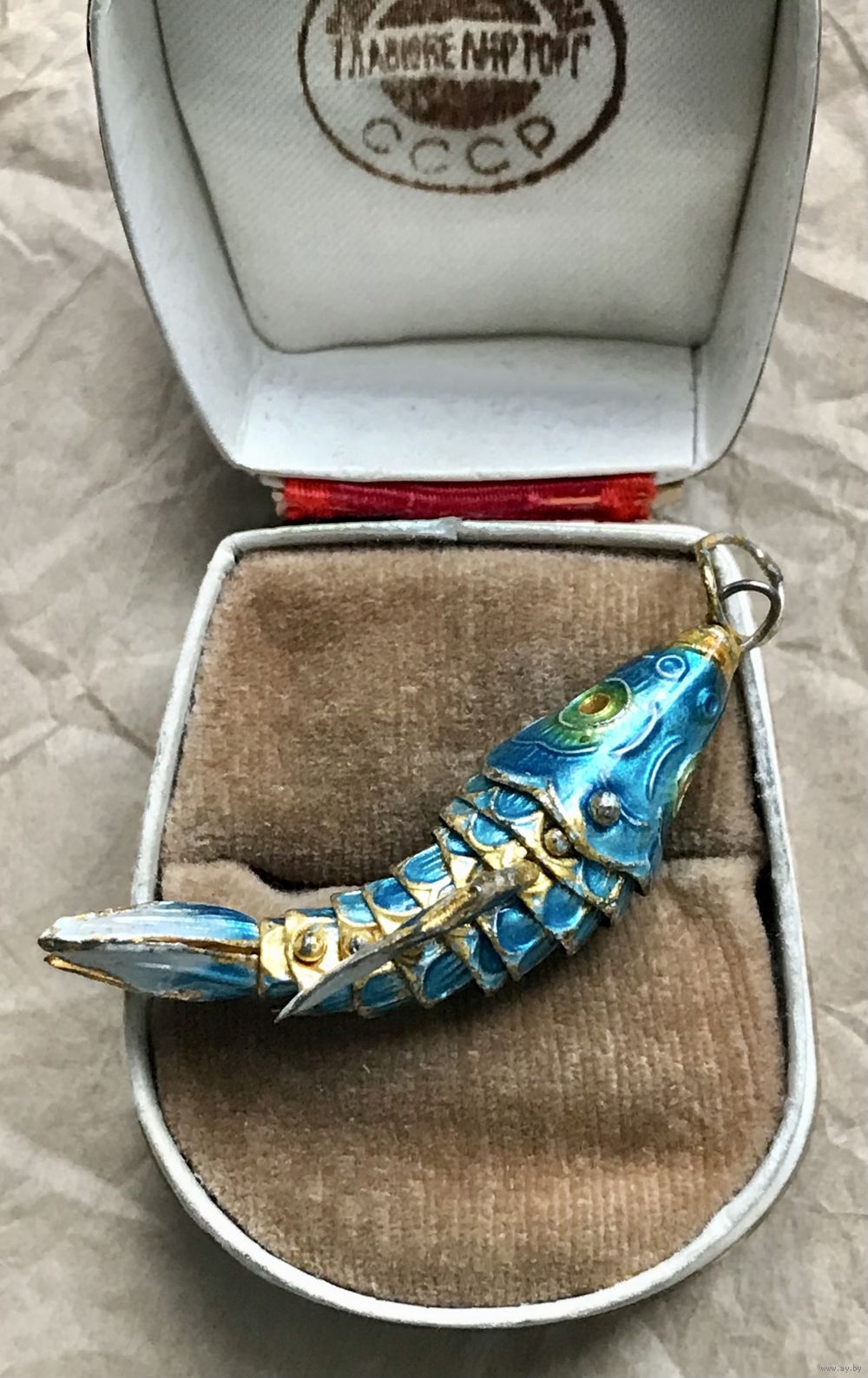 Кулон в виде рыбки с основой из латуни с позолотой, эмаль. Китай, 2-я пол.ХХв. Тело рыбки подвижно. Высота кулона с петлей 6см., высота рыбки 4,7см. Состояние хорошее.