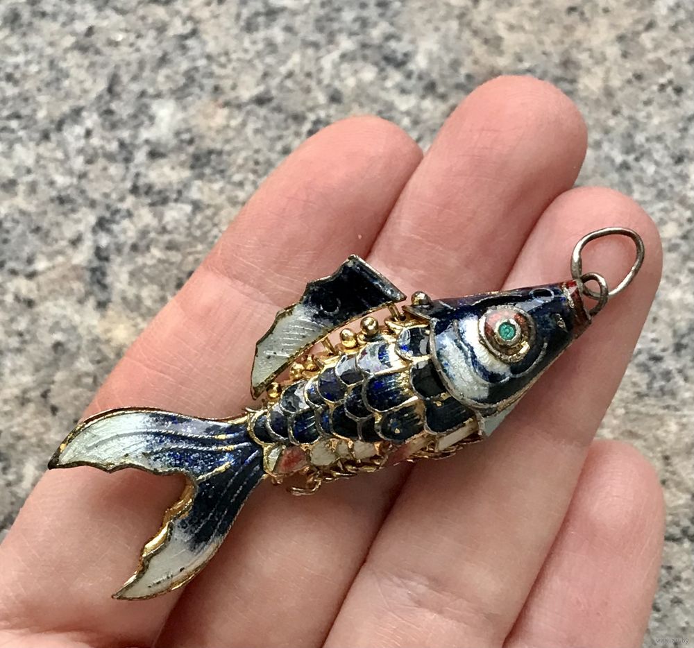 Кулон в виде рыбки с основой из латуни с позолотой, эмаль. Китай, 2-я пол.ХХв. Тело рыбки подвижно. Высота кулона с петлей 7см., размер рыбки 6,2х2см. Состояние хорошее.