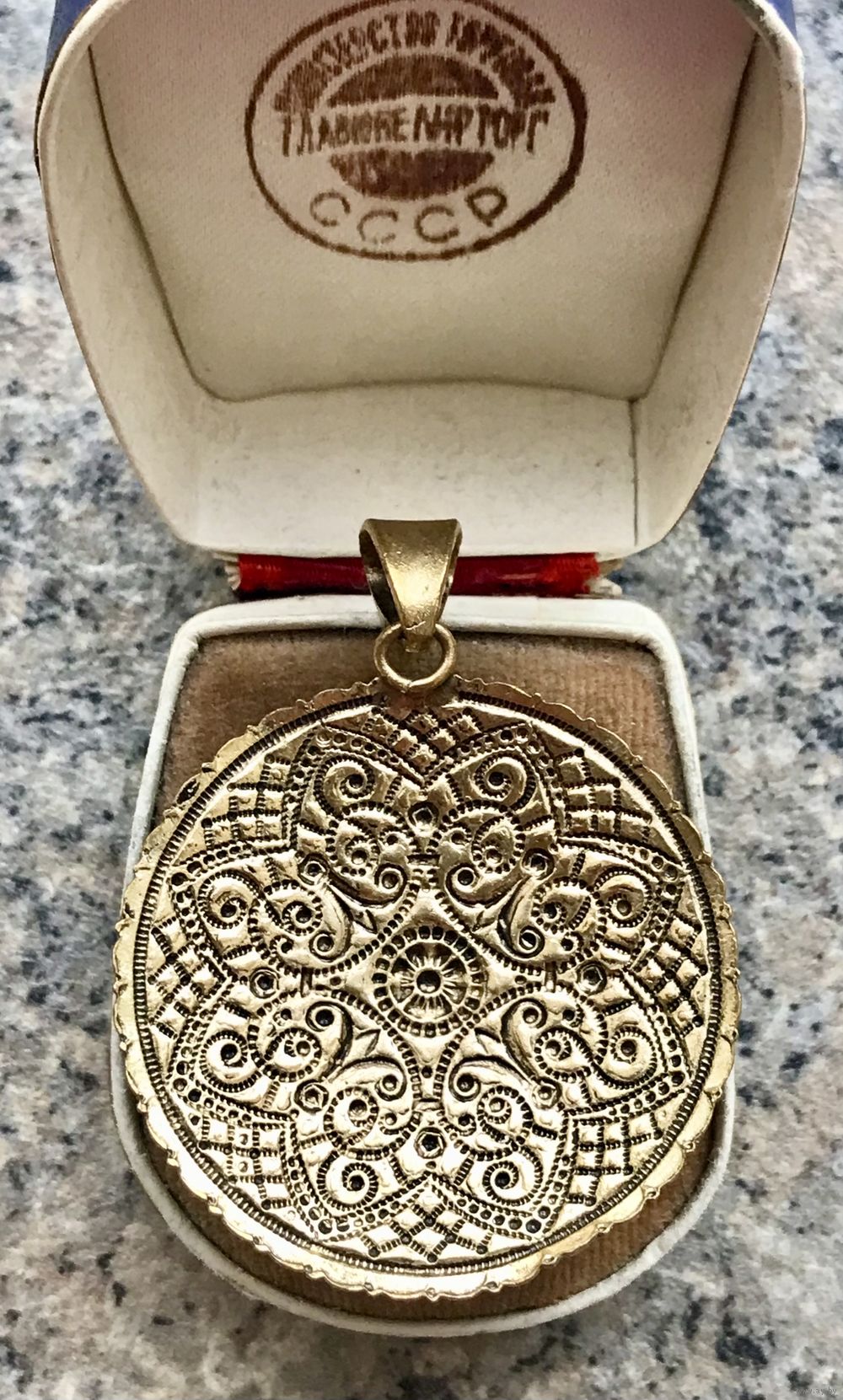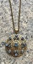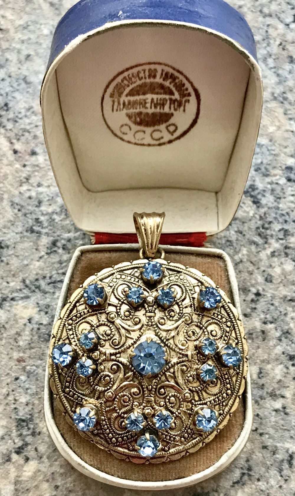 Винтажный чешский кулон из латуни, лицевая сторона украшена кристаллами голубого цвета. Высота кулона с петлей 5см., диаметр 4см. Состояние хорошее.